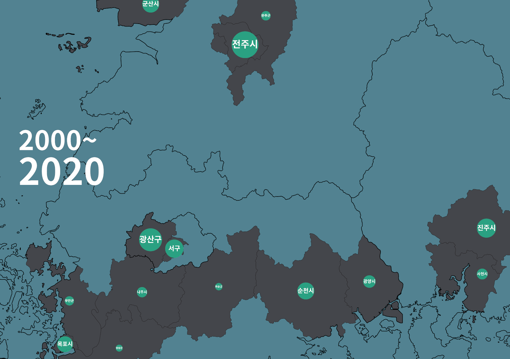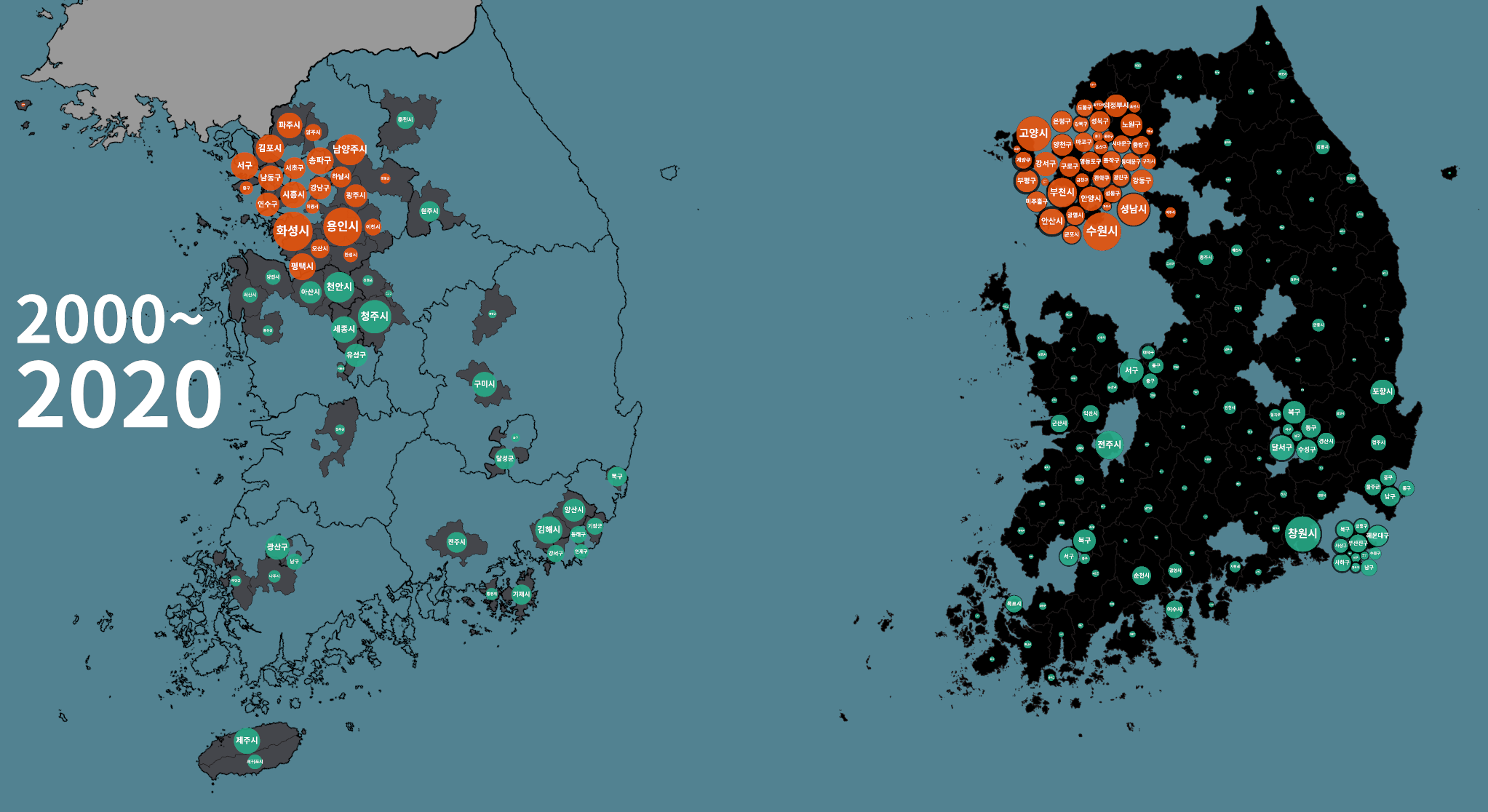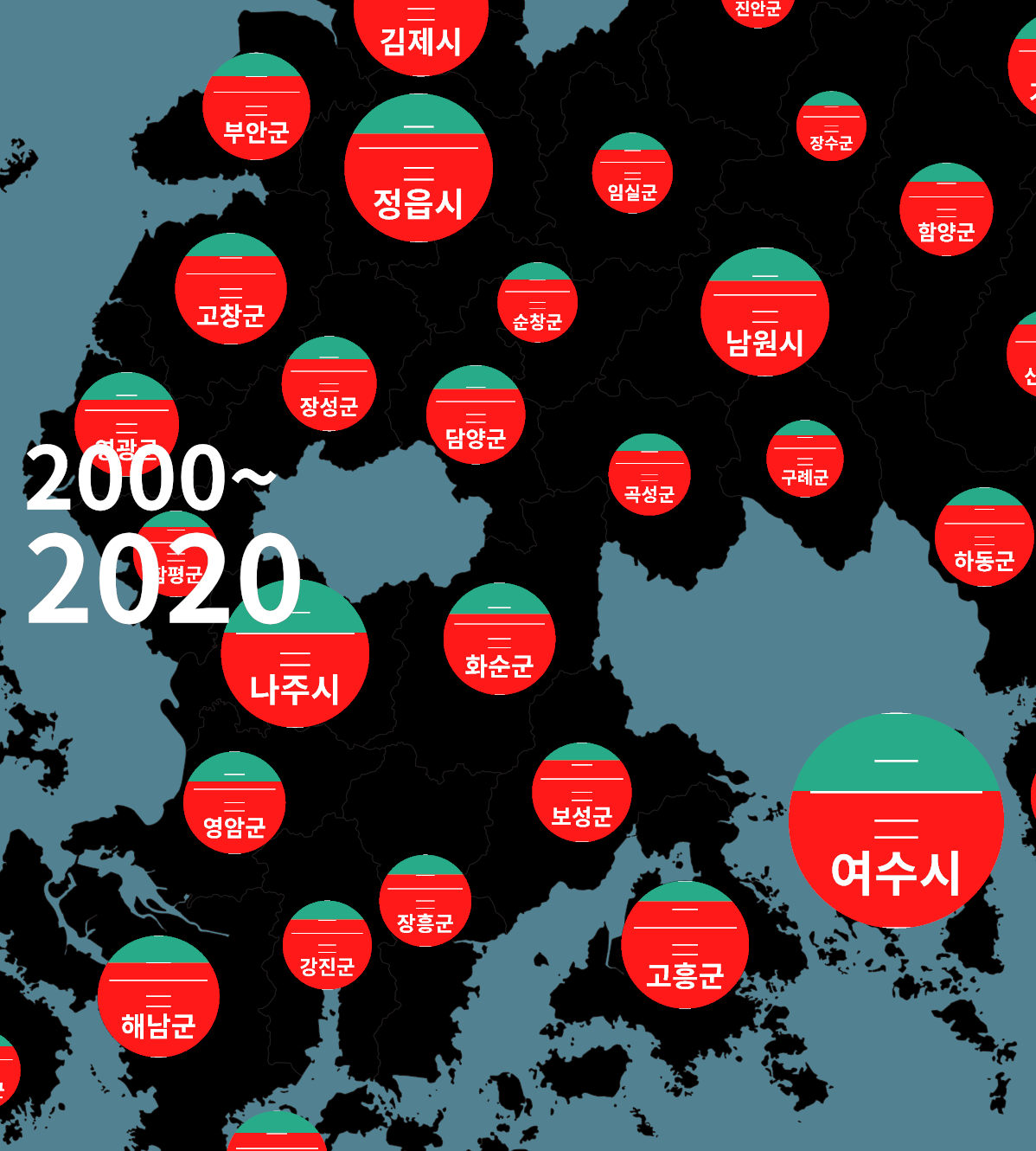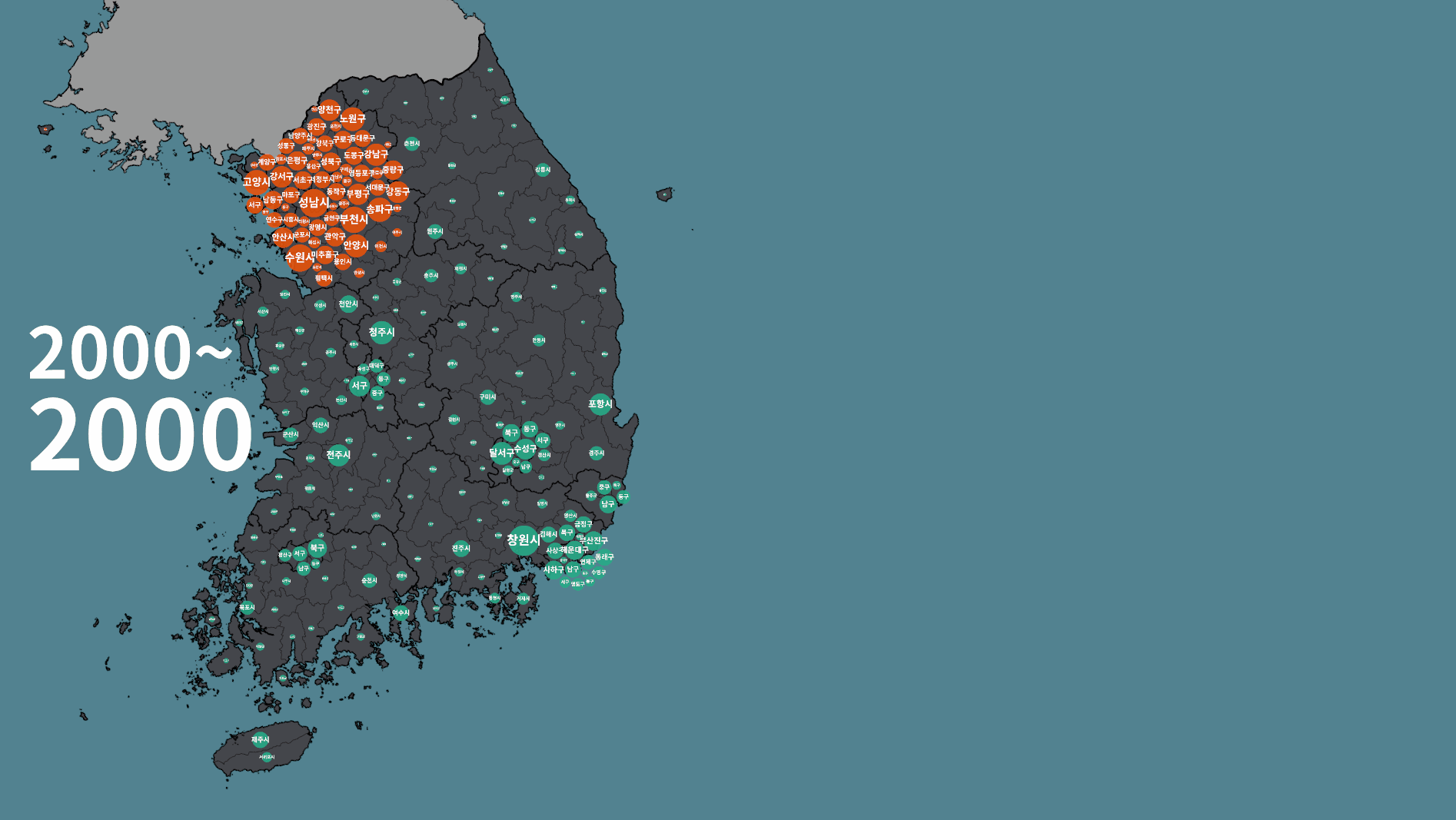 시작하자마자 모두 오른쪽으로 이동한다. 오른쪽은 해당 연도에 2000년 대비 인구가 감소한 지역들.