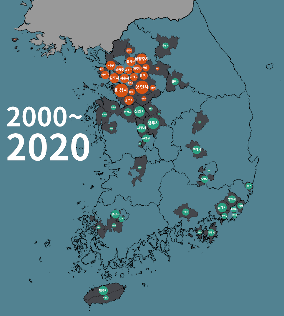 2000년 대비 2020년에 인구가 늘어난 시군구는 아래와 같다.