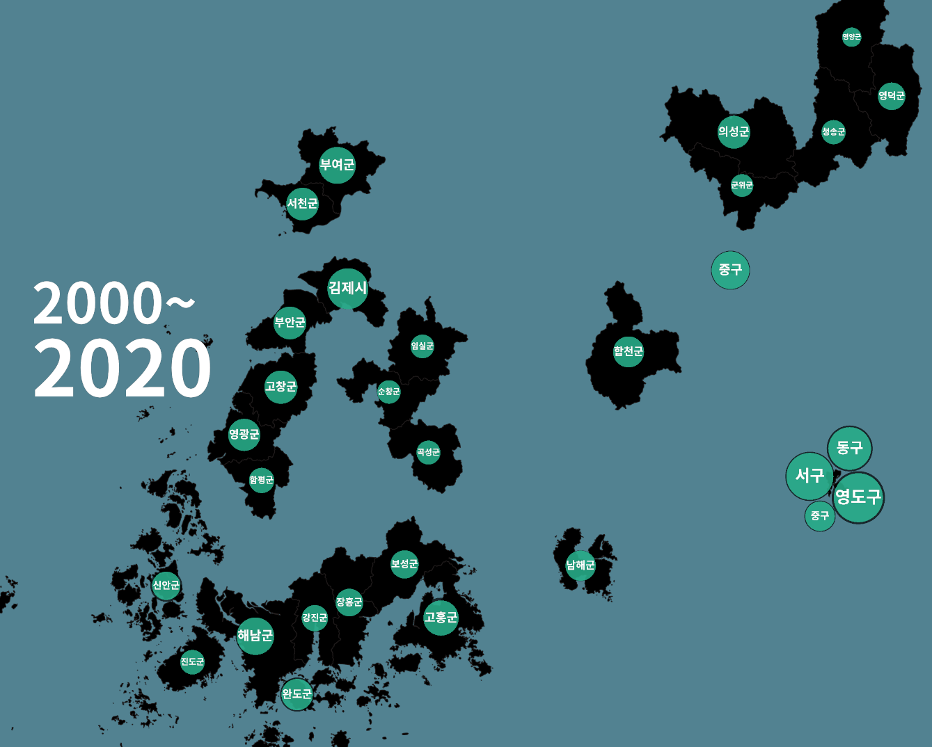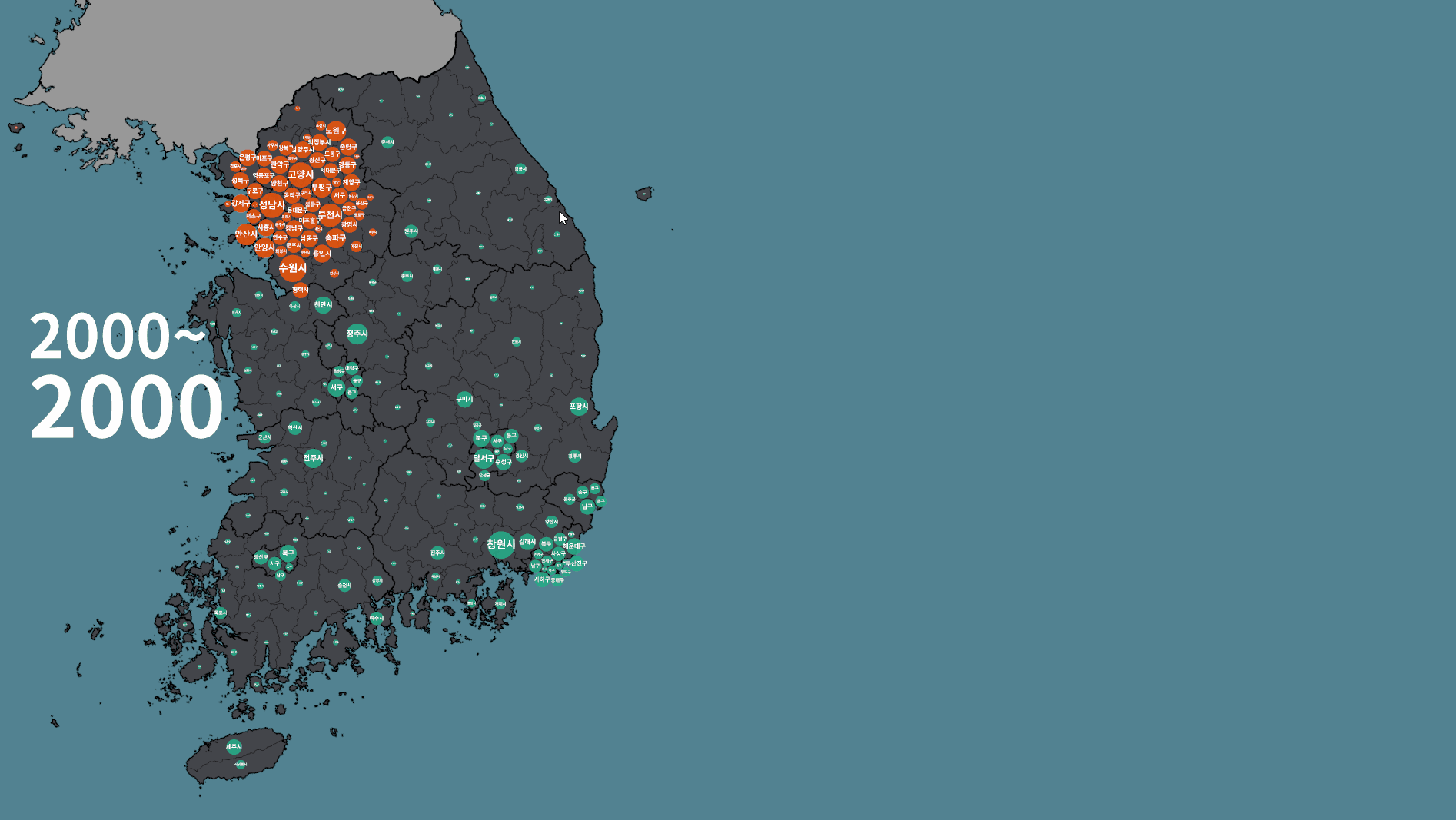 시작하자마자 모두 오른쪽으로 이동한다. 오른쪽은 해당 연도에 2000년 대비 인구가 감소한 지역들.