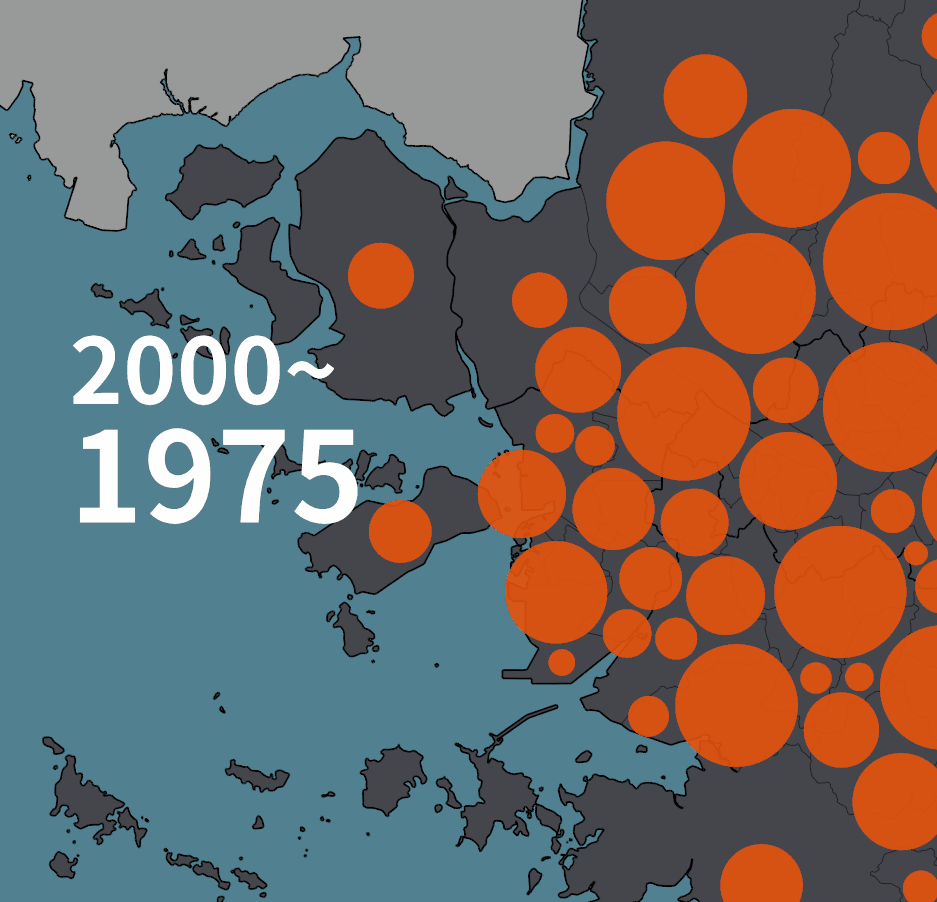 1975년 대비 인구가 줄어들었을 때는 다르게 그렸다. 바깥의 검은 테두리로 표현된 원의 크기가 1975년의 인구, 안쪽에 약간 어둡게 표현된 부분이 2020년의 인구다. 비수도권의 경우에는 푸른색 계열로 같은 규칙을 적용했다.