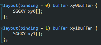 기본적으로 이 좌표중심 데이터는 저렇게 두 벌을 읽어들인다. 이런 방식은 nBody 시뮬레이션처럼 셰이더 기반의 상호작용을 계산할 때 기본적인 부분인데, 두개의 버퍼들을 읽기/쓰기, 쓰기/읽기 로 swap 해가면서 작업하게 된다. 예를 들어 짝수 프레임에서는 0번을 읽어들여 계산 결과를 1번 버퍼에 쓰고, 그 다음 홀수 프레임에서는 1번 버퍼를 읽어들여 0번 버퍼에 계산 결과를 업데이트 한다. 그렇게 해야 충돌 이전의 좌표와 충돌 이후 업데이트한 좌표들을 섞지 않은 채 독립적(병렬적)으로 다룰 수 있기 때문이다.