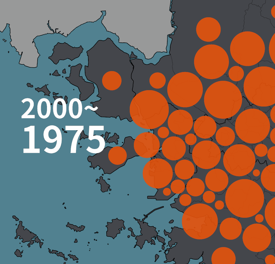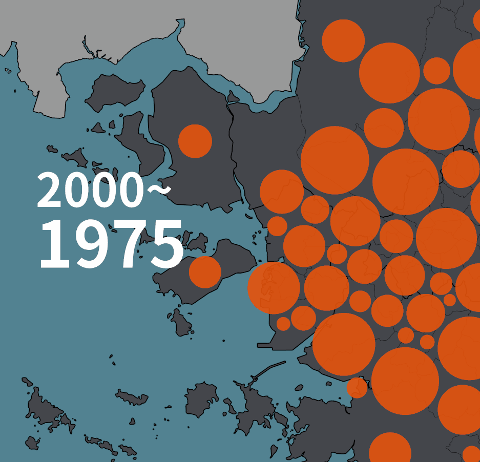 1975년 대비 인구가 줄어들었을 때는 다르게 그렸다. 바깥의 검은 테두리로 표현된 원의 크기가 1975년의 인구, 안쪽에 약간 어둡게 표현된 부분이 2020년의 인구다. 비수도권의 경우에는 푸른색 계열로 같은 규칙을 적용했다.