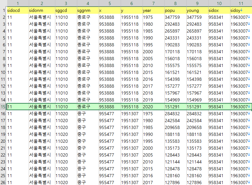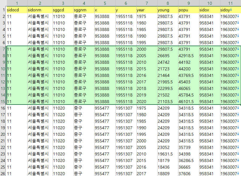 첫번째 1975년~2020년의 시군구 인구는 다음의 데이터 두 개를 결합했다.