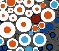 그리고 각각의 원은 중력 중심점이 있다. 시군구 중심일 경우 각 시군구 중심은 각각의 원이 회귀하고자 하는 중심이 된다. 충돌이 적을 경우에는 이 중력중심점으로 이동하도록 한다.