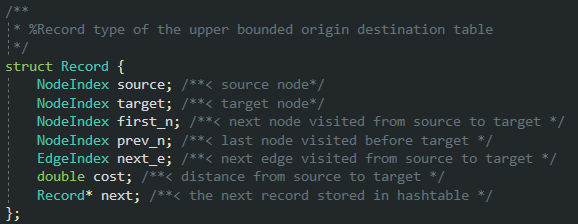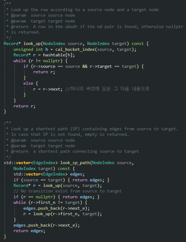 다른 함수에서 look_sp_path를 호출하게 되면 이 함수는 while 구문을 돌면서 next_n == target이 될 때 까지 look_up 함수를 반복하면서 값들을 읽어내려간다. loop_up 함수는 미리 구현된 해시함수를 이용하여 source-target의 key로 하는 데이터가 위치하는 곳을 찾아낸다. 만약 해시 값이 중복될 경우, Record 구조체의 next 변수를 이용해서 미리 연결된 병렬 저장 공간을 검토하게 된다.