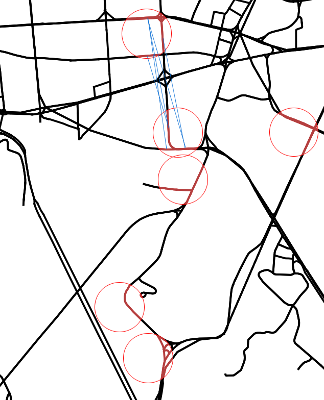 아래 그림에서 검은 선들이 입력한 네트워크, 붉은 선이 관찰된 궤적이라고 할 때, 붉은 동그라미 반경 r 안쪽에서 설정된 개수 k 만큼의 링크를 검색해서 후보군으로 올려두게 된다.