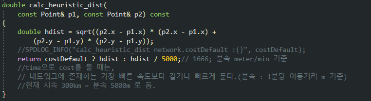 이 때는 거리 기준일 때 직선거리 즉 어떻게 해도 그보다 더 가까울 수 없는 기준을 찾은 것처럼, 시간 기준일 때는 네트워크에 존재하는 가장 빠른 속력을 찾아 적용시키면 되는 것 같다. 지금의 예시에서는 KTX와 도로망이 결합되어 있기 때문에 300km/h 로 두어 분속으로 변환해서 적용해 두었다. 만약 항공경로까지 결합된 multi modal 네트워크라면 국내 항공노선의 속도를 찾아서 적용시켜야 할 것 같다. 물론 휴리스틱 함수 값이 전체적으로 작아져서 A star 알고리즘의 효율은 좀 떨어지겠지만, 엉뚱한 경로를 찾지 않도록 하려면 어쩔 수 없다.