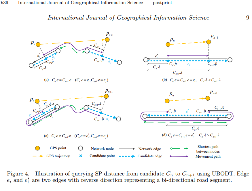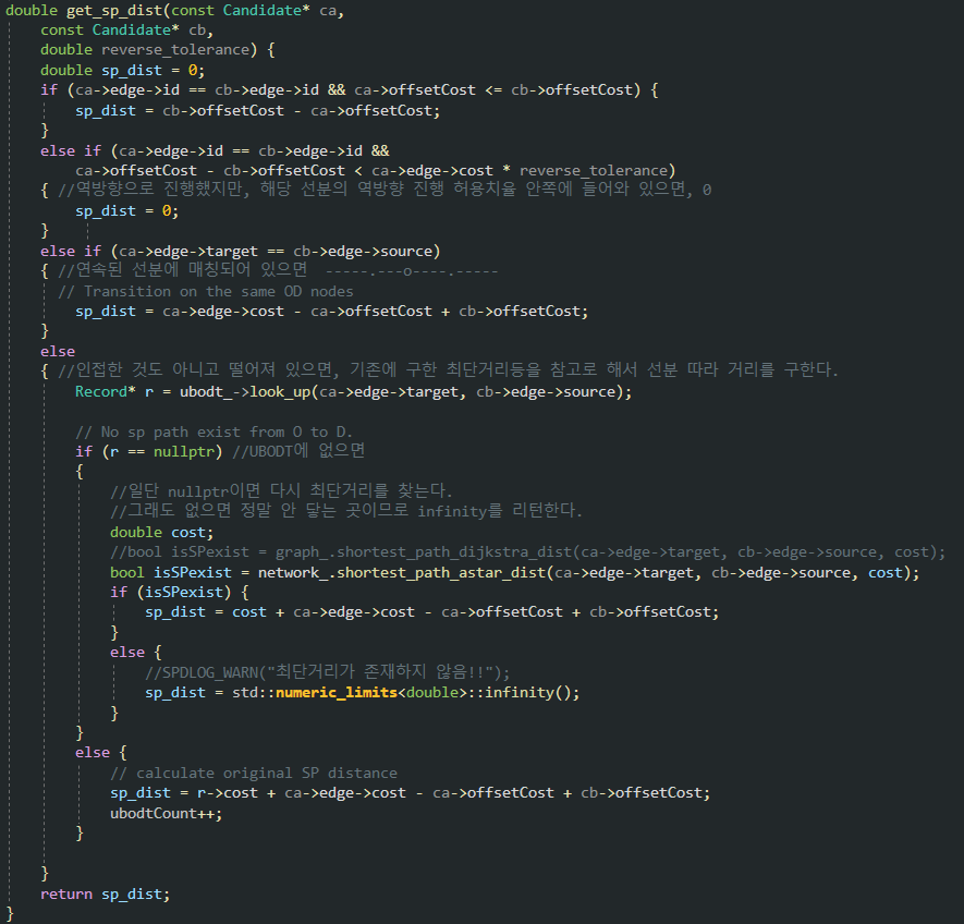sp_dist를 구하는 부분은 생각보다 조금 더 정교하게 구한다. 원 저작자의 논문에서도 이 부분을 상세히 설명하고 있다. 관측값 중 선행 노드와 후행 노드가 같은 링크에 매칭되었을 경우, 역방향 진행으로 생각될 경우 등 세분화시켜 판단하고 있다.