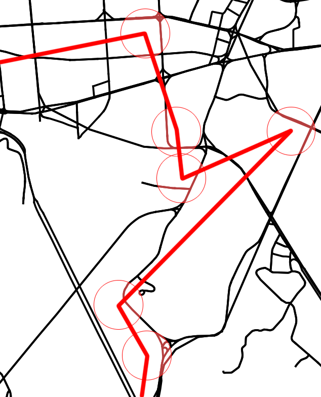 위의 그림은 눈으로 보면 확실하게 값이 튀었다는 것을 알 수 있지만, 맵 매칭 알고리즘에서는 정상적인 점으로 간주해서 빙 돌아가는 결과값을 받게 된다. 따라서 설정한 r 값보다 더 참값에서 벗어나는 관측값들이 존재한다고 판단될 경우 전처리를 통해 걸러내야 한다.