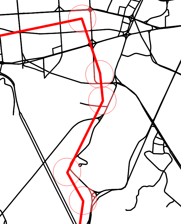 관측값이 가지고 있는 오차보다 반경 r을 너무 크게 잡으면 불필요하게 많은 연산을 하게 된다. 반대로 관측값이 통상적으로 가지고 있는 오차보다 r을 너무 작게 잡으면 은닉되어 있는 실제 주행 경로는 후보군에 오르지도 못하게 된다. 따라서 이 경우에 (참 값을 알고 있다는 가정 하에) 맵 매칭 결과와 참 값을 비교해보면 당연히 같을 수가 없다.