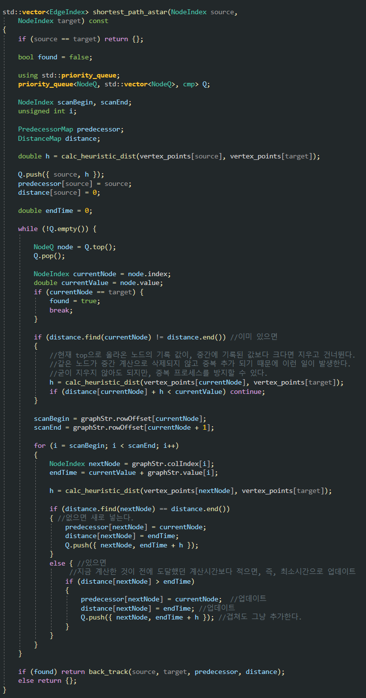 원 저작자의 코드에서 Boost 라이브러리를 떼어내고 fiboheap 대신 std::priority queue를 사용해서 약간의 차이가 있다. 좀 느리더라도 외부 라이브러리를 떼어낼 목적으로 fiboheap 대신 std::priority_queue 로 바꿔봤는데 의외로 좀 더 빨라서 그대로 사용하게 되었다.