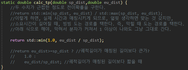 eu_dist(euclidean 거리) 즉 두 관측점 사이의 직선 거리를, sp_dist(shortest path) 임시 연결된 두 링크 사이의 최단거리로 나누어주면 tp가 된다. 1.0을 넘지 않도록 했다.