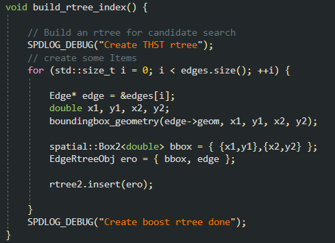 init 함수 내부를 보면 마지막 단계에 build_rtree_index( ) 를 호출해서 네트워크 선분들의 검색이 쉽도록 rtree 방식으로 인덱싱하고 있다.
