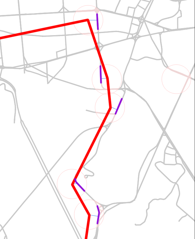 맵 매칭의 결과는 아래 그림과 같다. 매칭된 링크, 즉 보라색 선들을 찾아내는게 바로 맵 매칭이다.