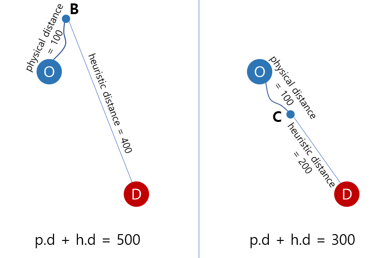 위의 그림처럼 다익스트라 알고리즘으로 계산할 때, B와 C는 O로부터 동일한 거리 100 만큼 떨어져 있지만, A star 알고리즘으로 계산하면 휴리스틱 거리가 덧붙게 되어 500과 300으로 차이가 나게 된다. 이러한 차이는 우선순위 큐에서 목적지와 반대로 진행하는 방향의 탐색에 대해 패널티를 주게 된다.