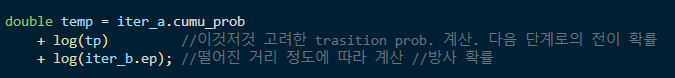 비터비 알고리즘에서 각각의 확률은 선행노드가 가지고 있는 이제까지의 누적 확률에, 선행 노드와 후행노드의 전이 확률(transition probability), 그리고 후행 노드의 방사 확률(emission probability)을 곱해서 결정된다. 여기서는 로그 값을 씌워서 곱셉을 덧셈으로 만들었다. 너무 작은 수가 되어버리는 것을 방지하는 장치인듯 하다.