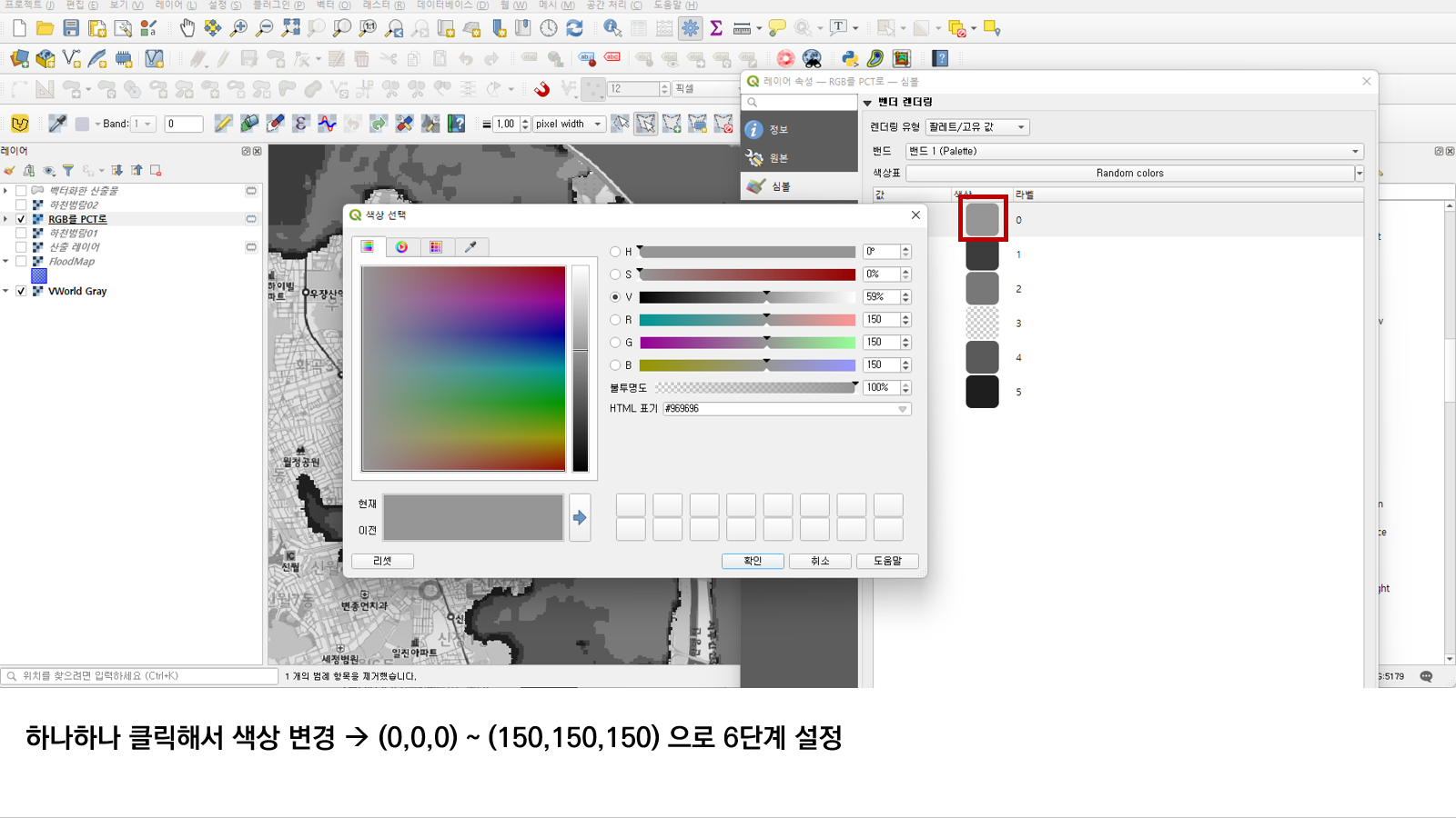 'RGB를 PCT로@1' 은 현재 PCT로 변환한 레이어의 밴드가 하나뿐이기 때문에 밴드 번호 1번이 @1로 표현되어 있다고 이해하면 된다.