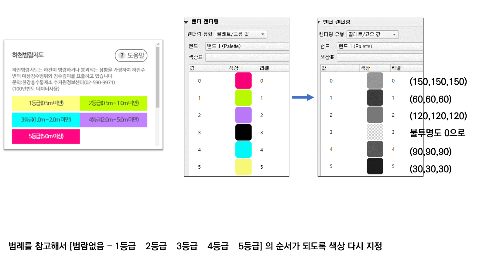 래스터 분석에 이용하려면 지도에 부여된 1등급~5등급이 1차원의 척도로 구분되어 있어야 한다. 그런데 현재 변환된 지도는 RGB 값을 모두 갖고 있고, R, G, B 각각의 차원에서 1등급~5등급이 순서대로 구분되어 있지 않고 엉켜 있으므로 그 정리 작업을 해줘야 한다.