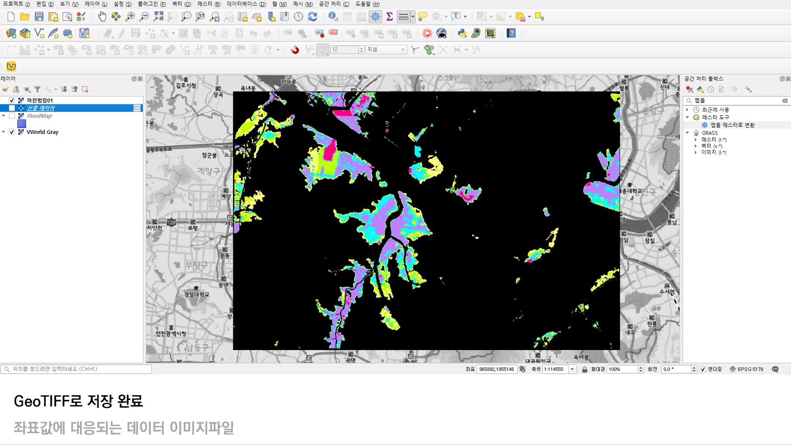 현재 행안부에서 서비스되고 있는 생활안전지도 중 하천범람지도를 QGIS에서 읽어들이고, 래스터와 벡터 형식의 파일로 변환 및 저장하는 방법을 다루었습니다.
