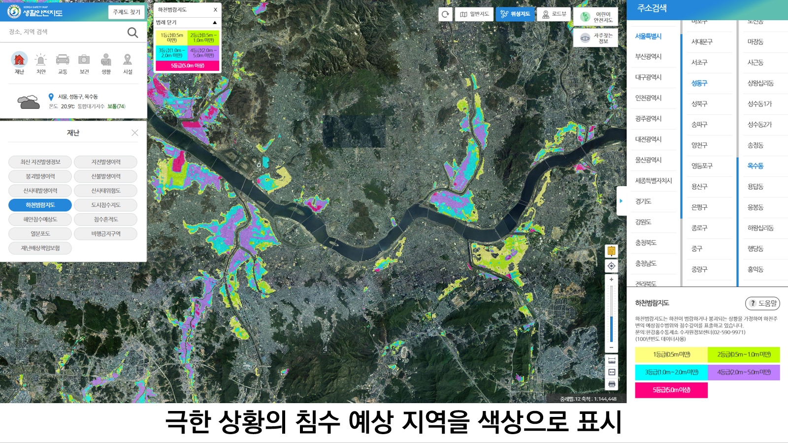 재난 아이콘을 클릭하면 '하천범람지도'를 다시 찾을 수 있다.