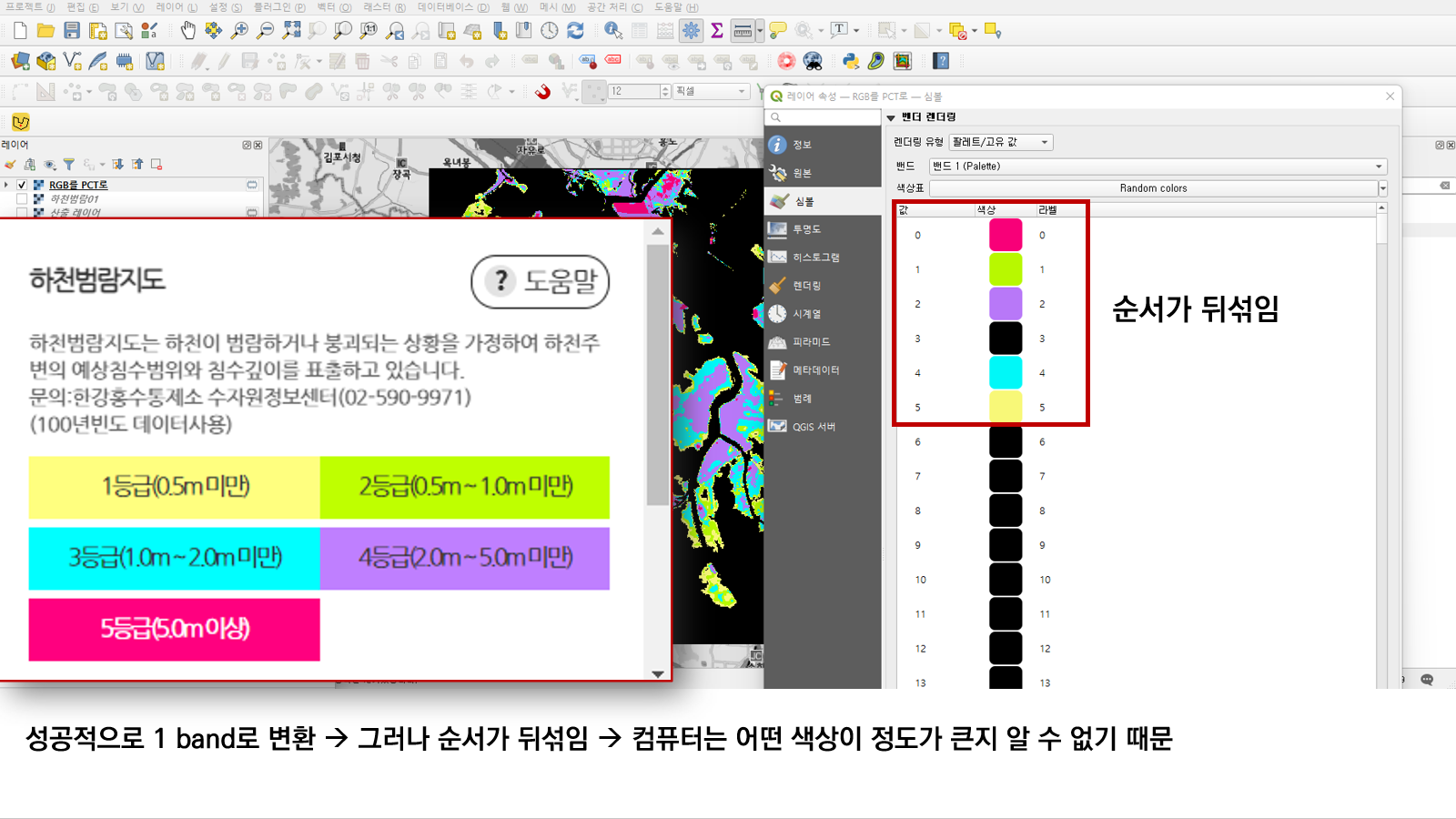 결과는 1 band로 변환되었으나, 여전히 순서가 뒤섞여 있다. 색상을 정리해서 다른 이름으로 다시 저장해줘야 한다.
