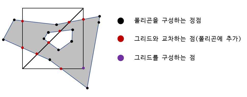 이제 각각의 그리드들에서 도형의 선분과 그리드의 선분들을 바탕으로 폴리곤을 재구성한다.
