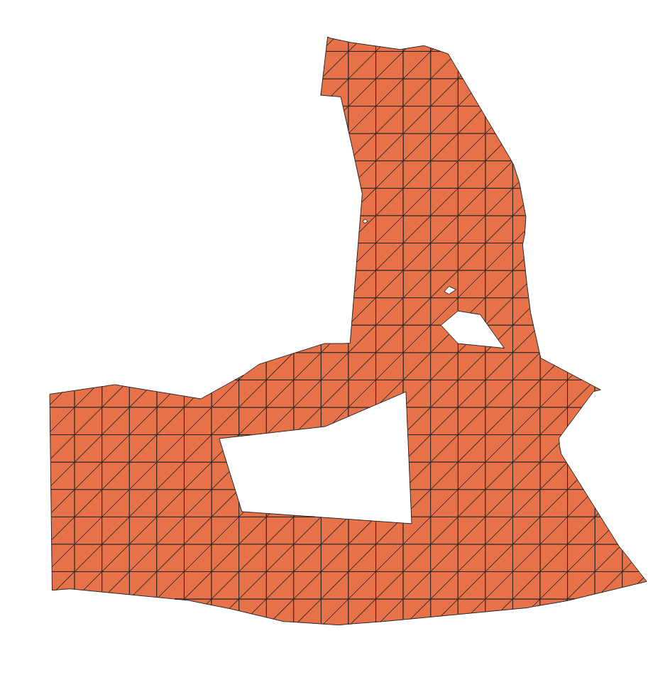 이러한 작업은 Qgis에서 폴리곤과 삼각형 그리드를 미리 만들어놓고, intersect 기능을 이용해서 만들어낼 수 있다. 다만, 그리드 분할에 최적화된 함수가 아니기 때문에 대량의 작업을 할 때 속도가 빠르지 않다.