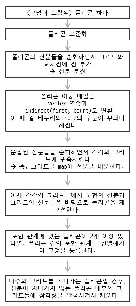 다수의 그리드를 지나가는 폴리곤일 경우, 선분이 지나가지 않는 폴리곤 내부의 그리드들에 삼각형을 발생시켜서 채운다.
