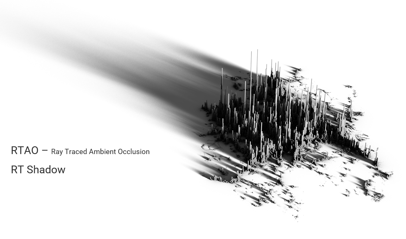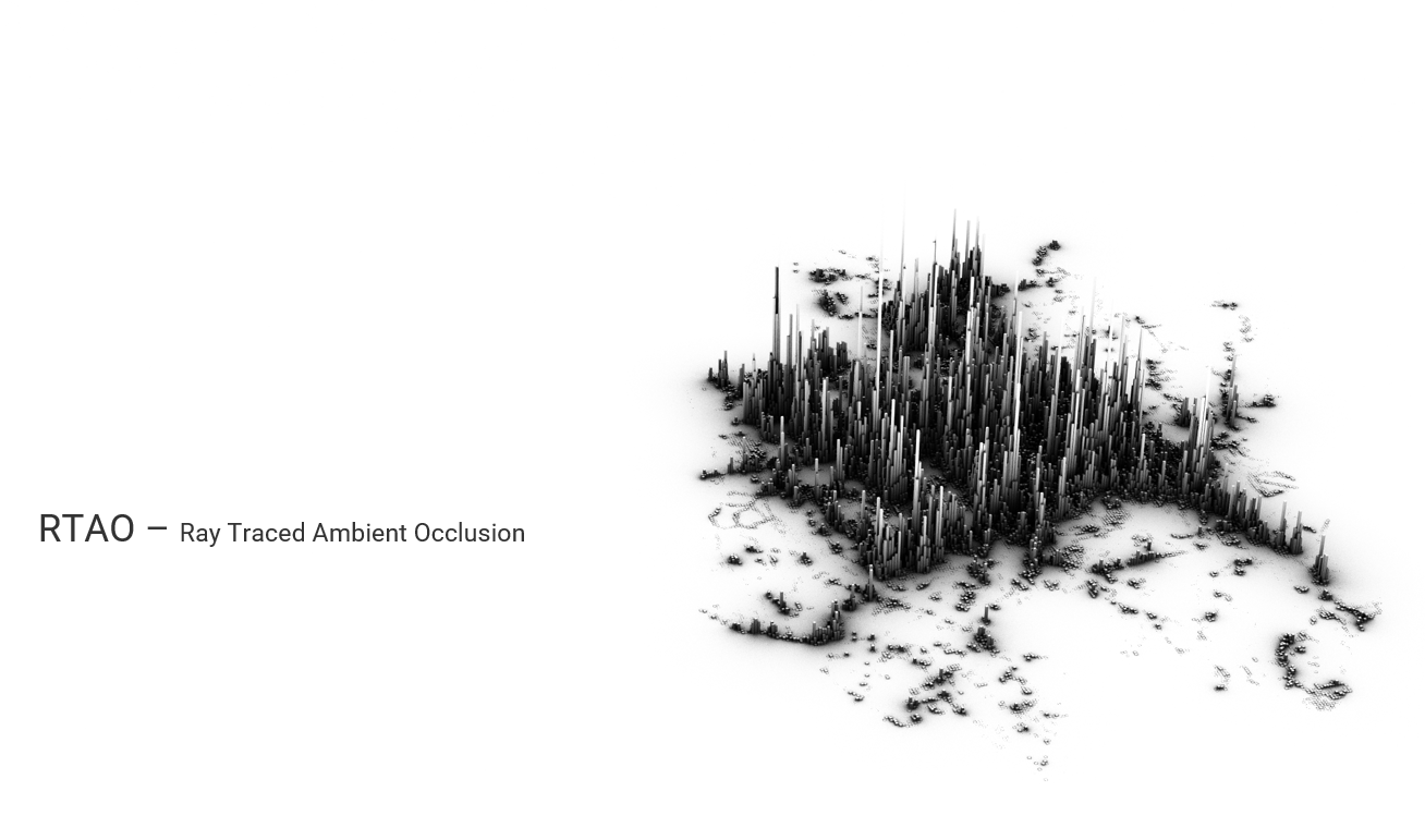 첫번째는 RTAO. Ambient Occlusion 을 ray trace 방식으로 계산해서 넣었다. 직사광을 받지 않는 부분에서 음각으로 들어간 부분들일수록 어둡게 보이는 효과를 말한다. 특정 표면의 한 픽셀에서 주변으로 랜덤하게 10~100개 정도의 광선을 발생시킨 후, 가까이에서 다른 표면이 감지되면 해당 픽셀을 좀 더 어둡게 만든다.