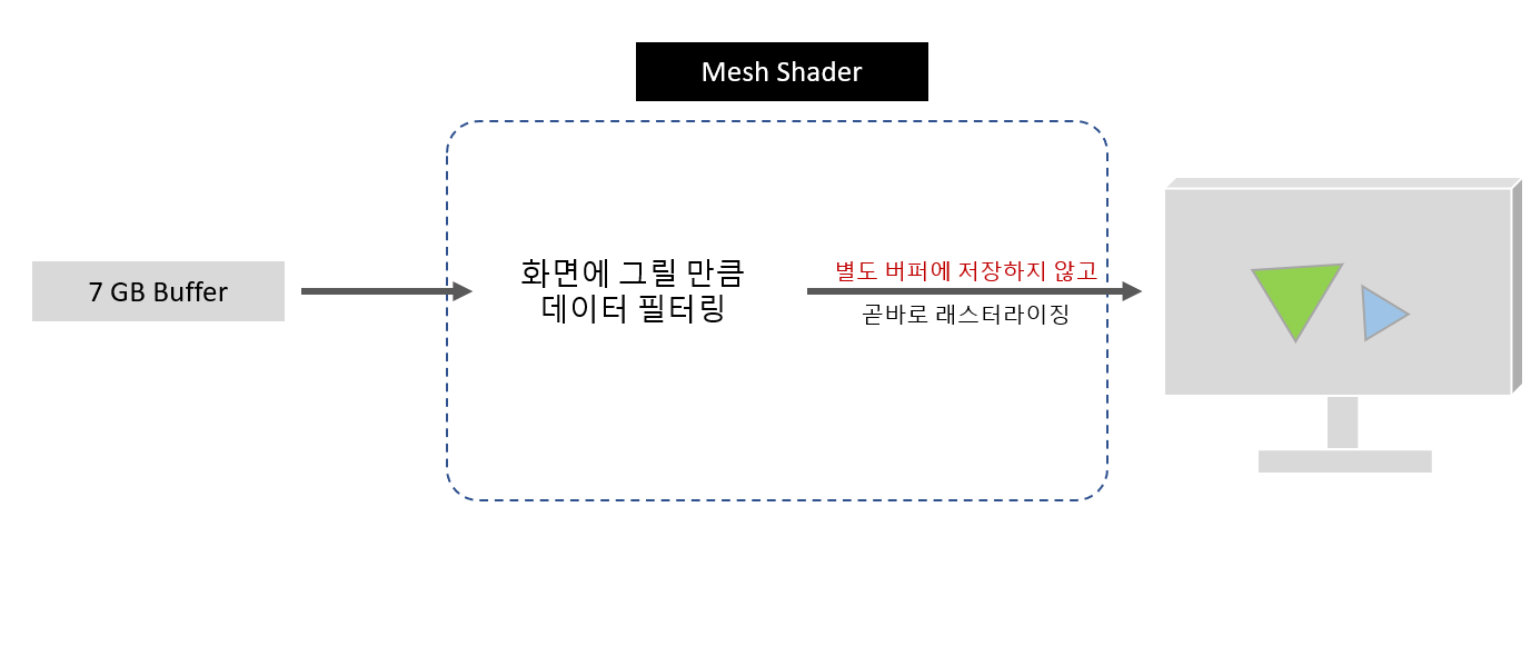 대신 메시 셰이더는 그 과정이 하나의 파이프라인에서 이루어지므로 별도의 버퍼를 저장하지 않고 파이프라인 간의 연계 과정에서 아주 빠른 메모리(캐시)를 사용하게 된다.