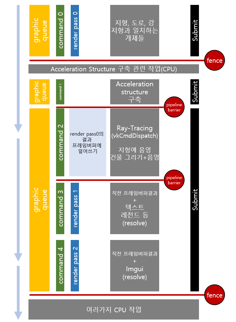 사실, 아주 잘 만든 렌더 패스라고 말할 수는 없다. Vulkan은 동기화가 늘 골치아픈데, 이러저러한 방식으로 시도해보다가 validation error 가 계속 발생해서 되돌리기도 했다. 혹은 선행 작업이 완료되기 전에 다음 작업이 완료되는 바람에 개체들의 진행이 꼬이는 등 여러가지 문제가 발생하기도 했다.