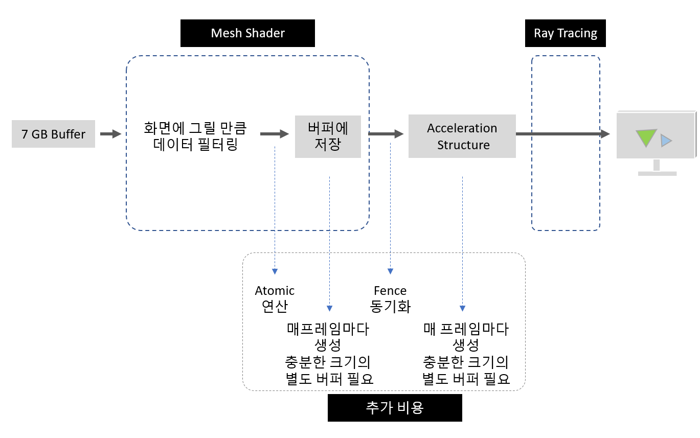 결국 메시 셰이더 작업 이후에 레이 트레이싱을 해주려면, 메시셰이더에서 삼각형들을 프래그먼트 셰이더로 보내기 직전에 별도 버퍼에 저장해주어야만 한다. 이 과정에 병목이 걸린다. 버퍼를 차곡차곡 쌓으려면 어쩔 수 없이 atomic 연산으로 번호를 붙여주는 작업을 해야 하기 때문이다.