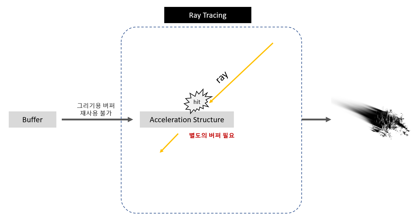 다시 말해, 아래와 같이 별도 버퍼를 생성한 후, 그 버퍼로 가속 구조도 만들어줘야 레이 트레이싱이 가능하게 된다. 그런데 메시 셰이더를 가장 효율적으로 이용하려면 곧바로 래스터라이징으로 끝내버려야 하기 때문에, 정상적인 과정이라면 아래 버퍼는 존재할 틈이 없다.