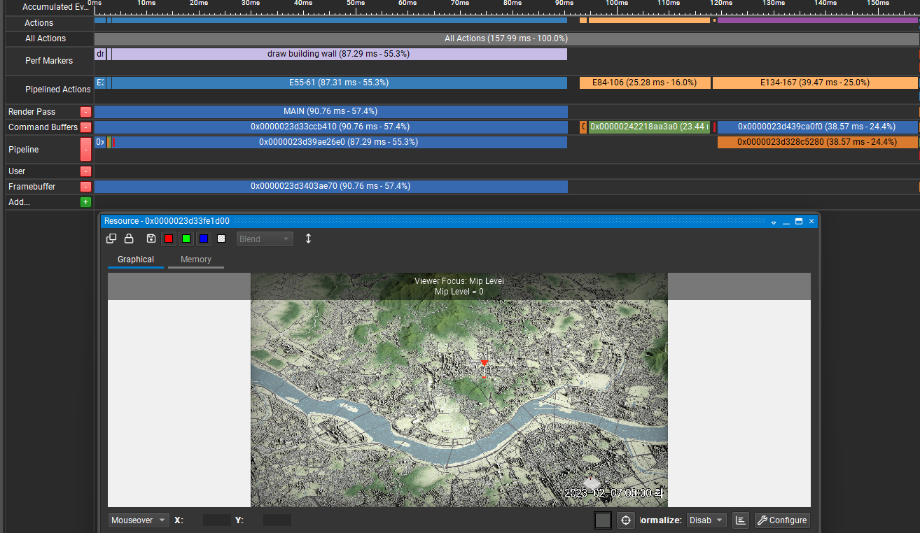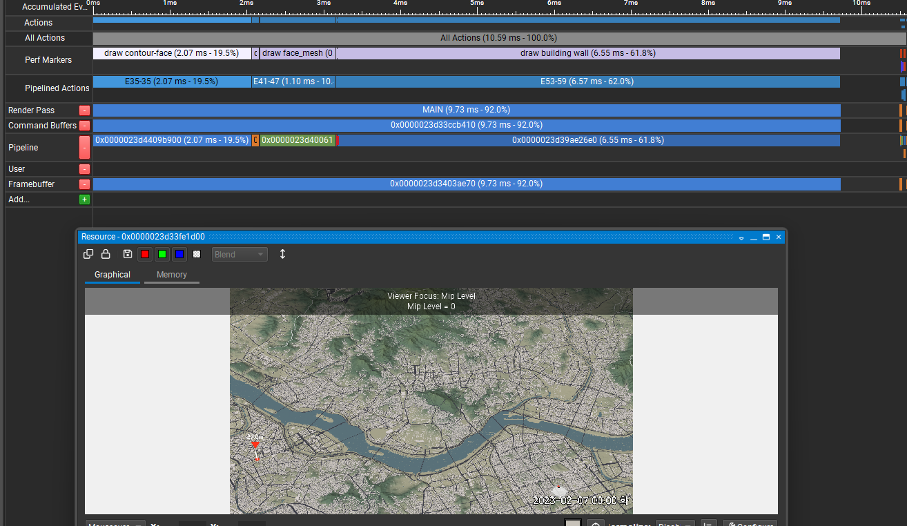 메시 셰이더만 거쳤을 때 6.55ms 였던 건물 렌더링은 버퍼에 저장하는 과정이 추가되면서 87.29ms로 늘어났다. 그 다음에 25.28ms가 가속 구조 등록, 39.47ms가 레이 트레이싱 부분이다.