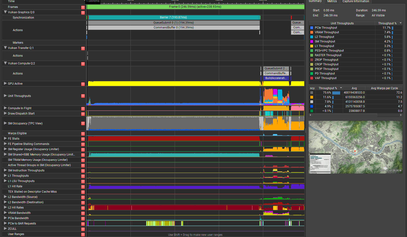 GPU Trace로 비슷한 장면을 다시 보면, 194.39ms라는 엄청난 시간의 작업이 등장한다. 이게 바로 건물을 그리는 부분인데, 좀 더 아래를 보면 SM 은 거의 쓰지 않고, L2 Hit Rate만 높다. 아마도 한 줄로 서서 atomic 저장을 하느라고 메모리만 많이 사용하고 계산은 별로 하지 않기 때문에 저렇게 나오는 것 같다.(해석이 정확한지 잘 모르겠다. Nsight 보는 법을 더 익혀야 한다)