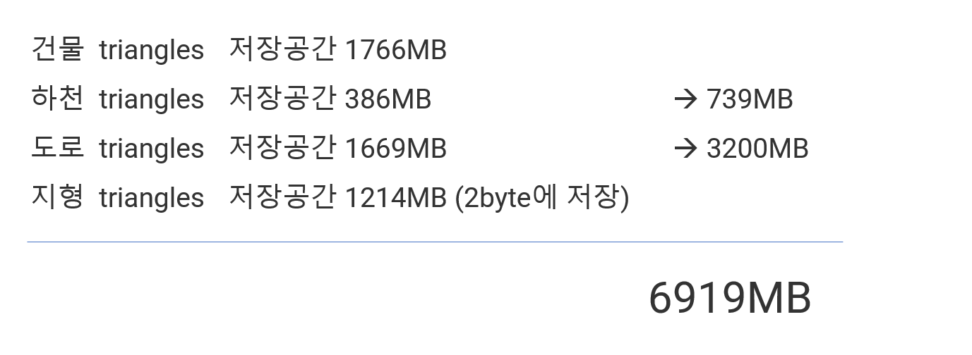 위에서 링크된 메시 셰이더 작업에서는 건물 1766MB, 하천 386MB, 도로 1669MB, 지형 1214MB의 데이터를 사용했다. 아래에서 설명하는 작업에서는 하천과 도로를 지형과 같은 그리드 크기로 잘게 분할하느라 용량이 각각 두 배 가량 늘어났다. 총 7GB 정도의 데이터가 되었다.