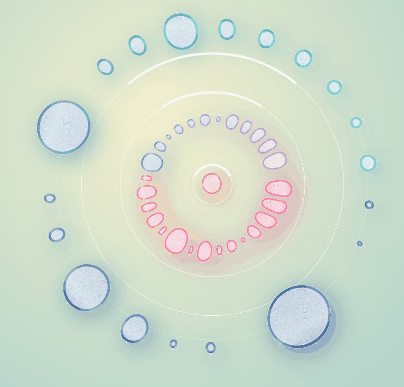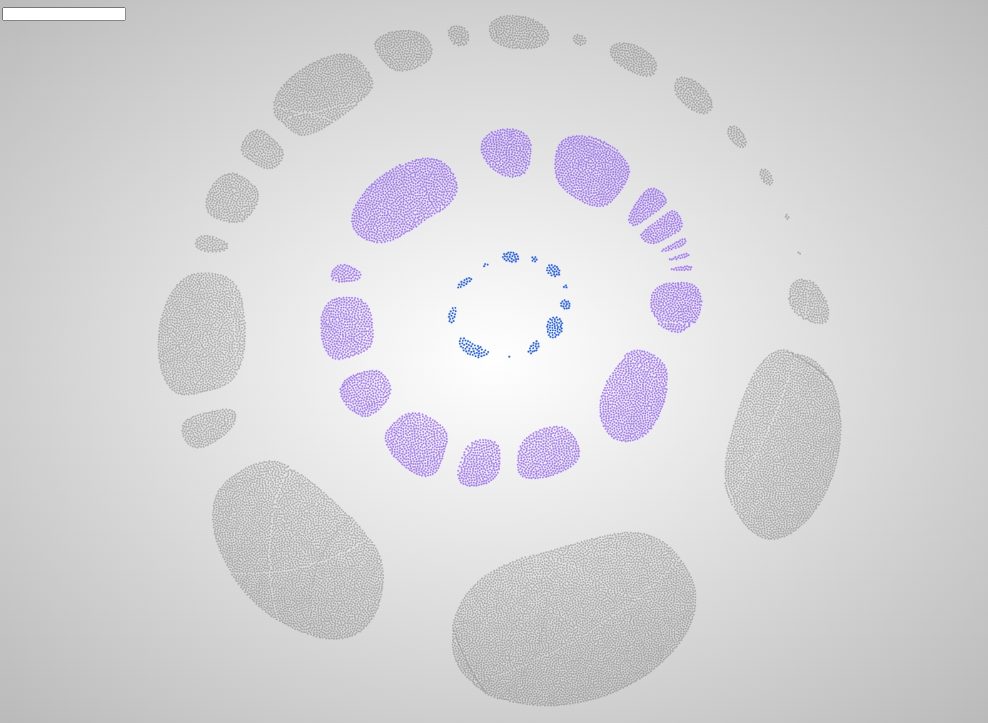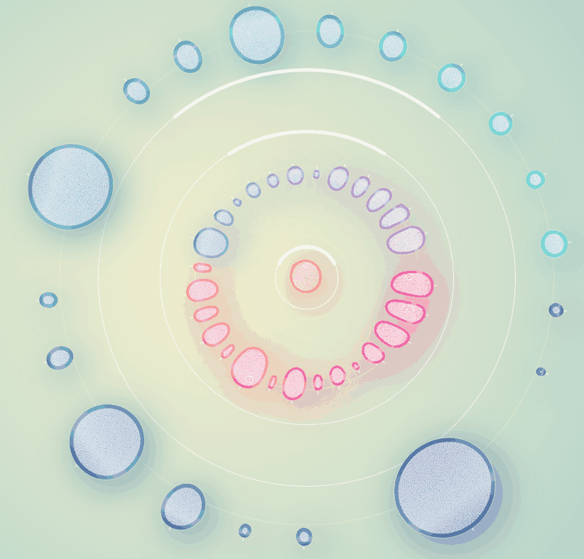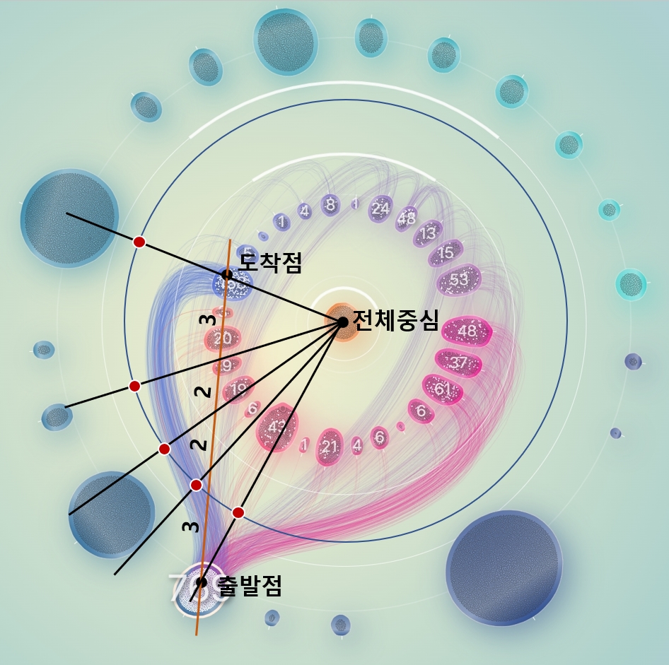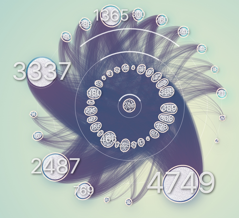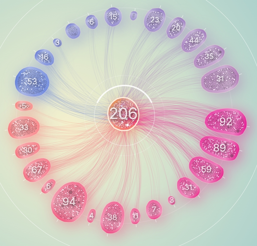 그래서 일단 노드들을 계열과 그룹으로 구분해보기로 했다. 계열은 중심으로부터 떨어진 반지름으로 구분했으며, 하나의 원을 이루는 동일 계열들을 20여개의 그룹으로 분리해서 그룹 각각이 구심점을 갖도록 했다.