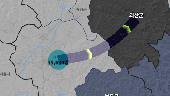 밑에다가 같은 데이터로 선굵기 등이 비슷한 옵션의 PathLayer를 깔아서 전체 이동 경로를 표현한 뒤, TripsLayer를 형광색으로 덧붙였다.
