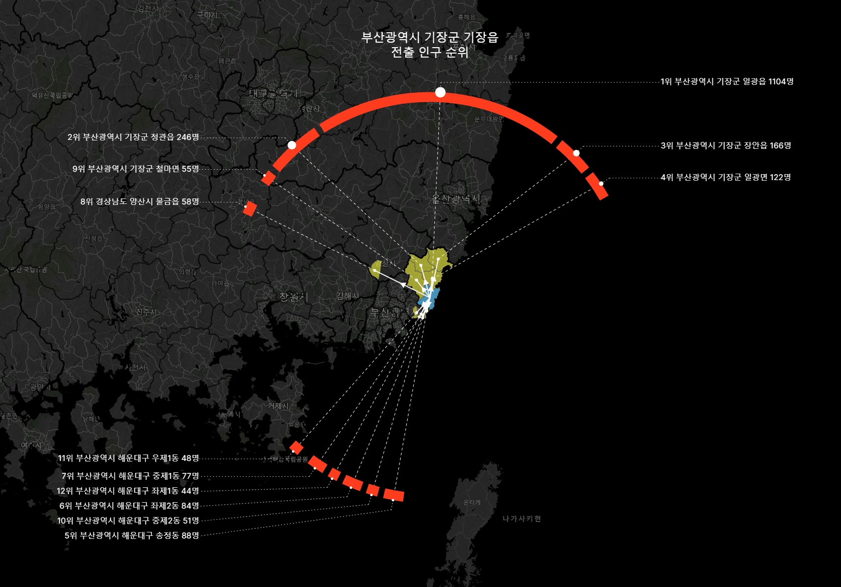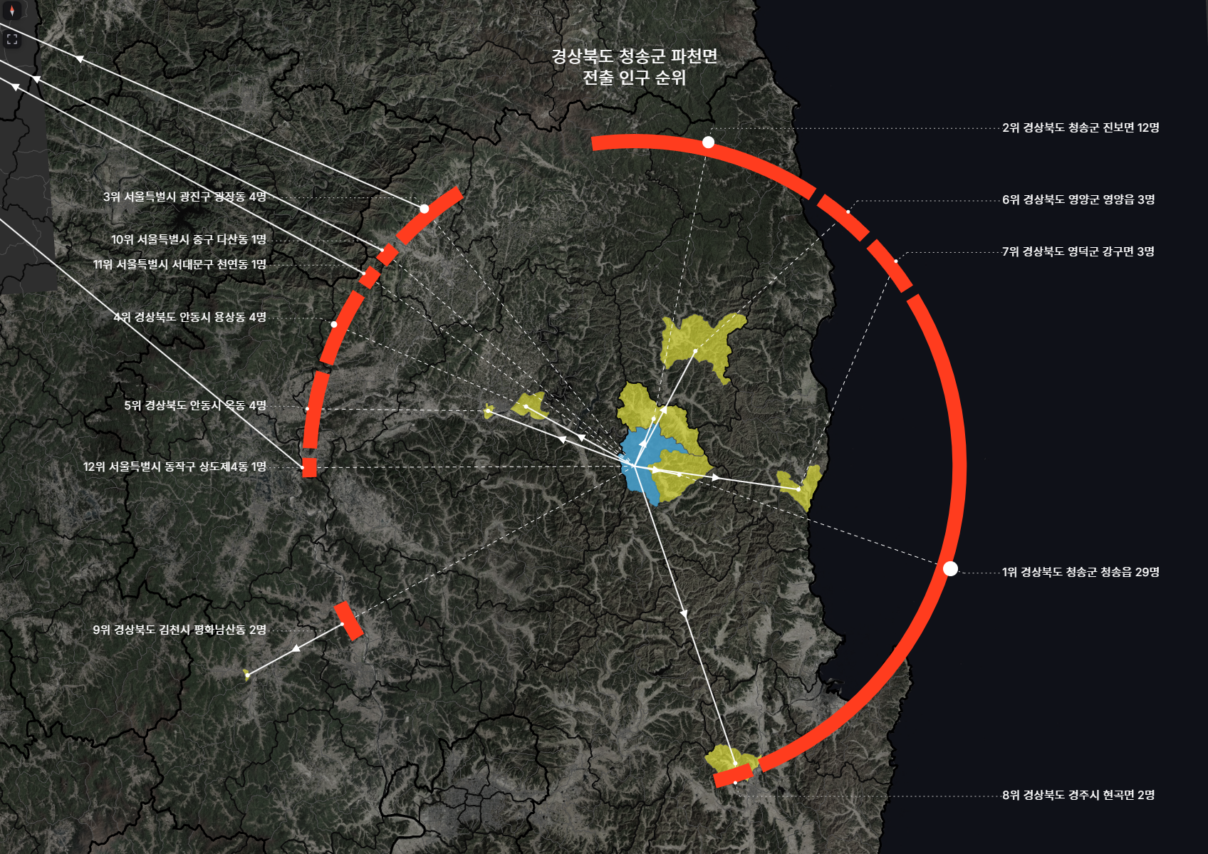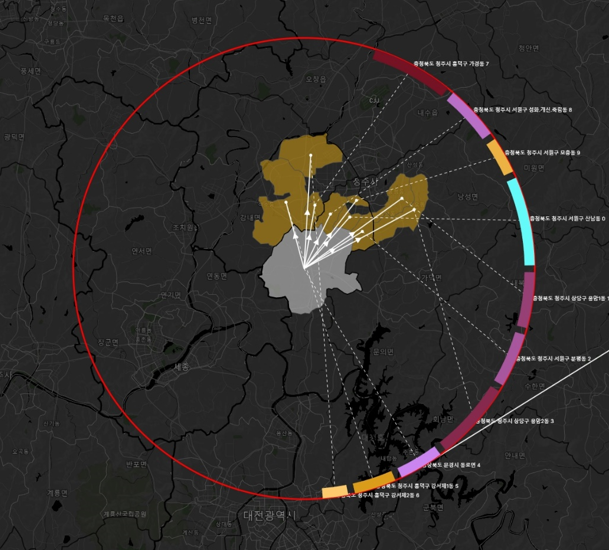 만약 전체 전출량이 1000명이고, 1위 읍면동으로의 전출량이 100명이라면 그 읍면동의 연장선이 닿는 환형상에는 360도의 10% 인 36도만큼의 진하게 색으로 표시한다.
