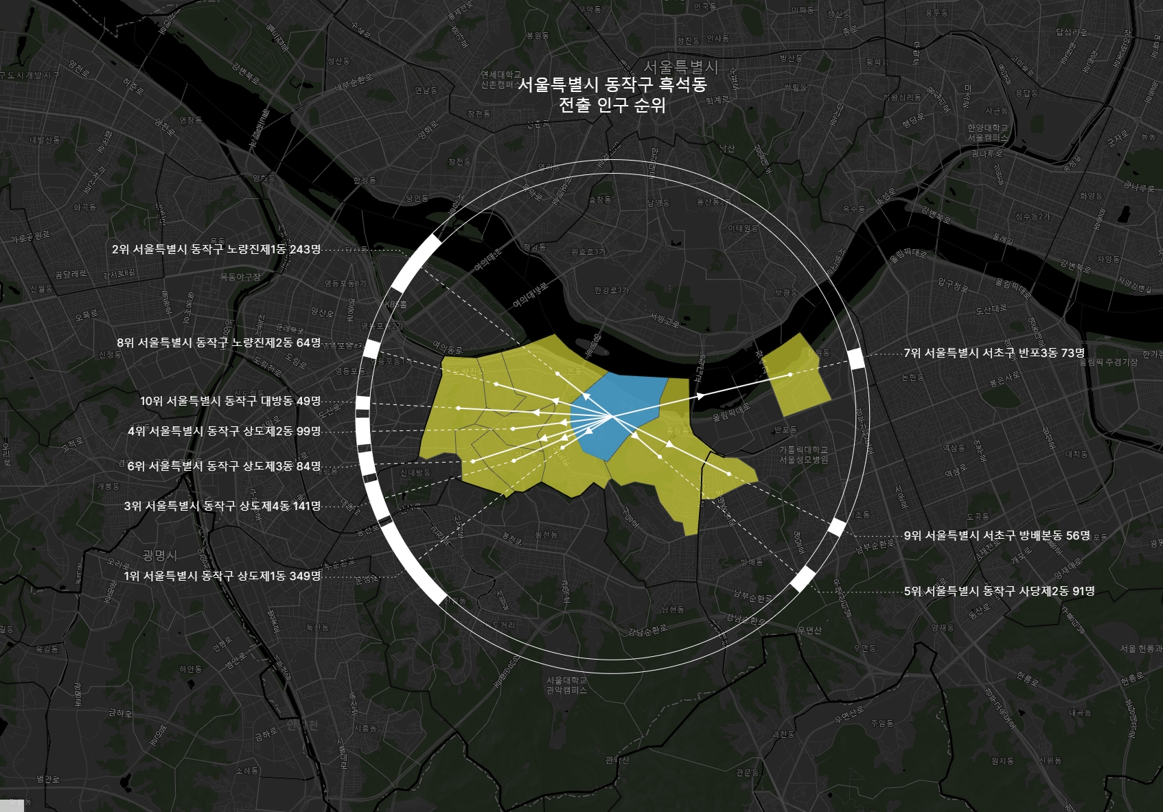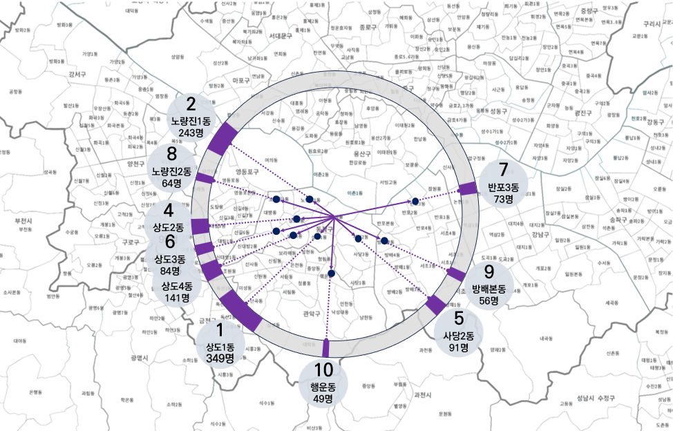 위의 예시는 흑석동에서 타 읍면동으로 전출한 경우 중 상위 10위까지를 표현하고 있다.
