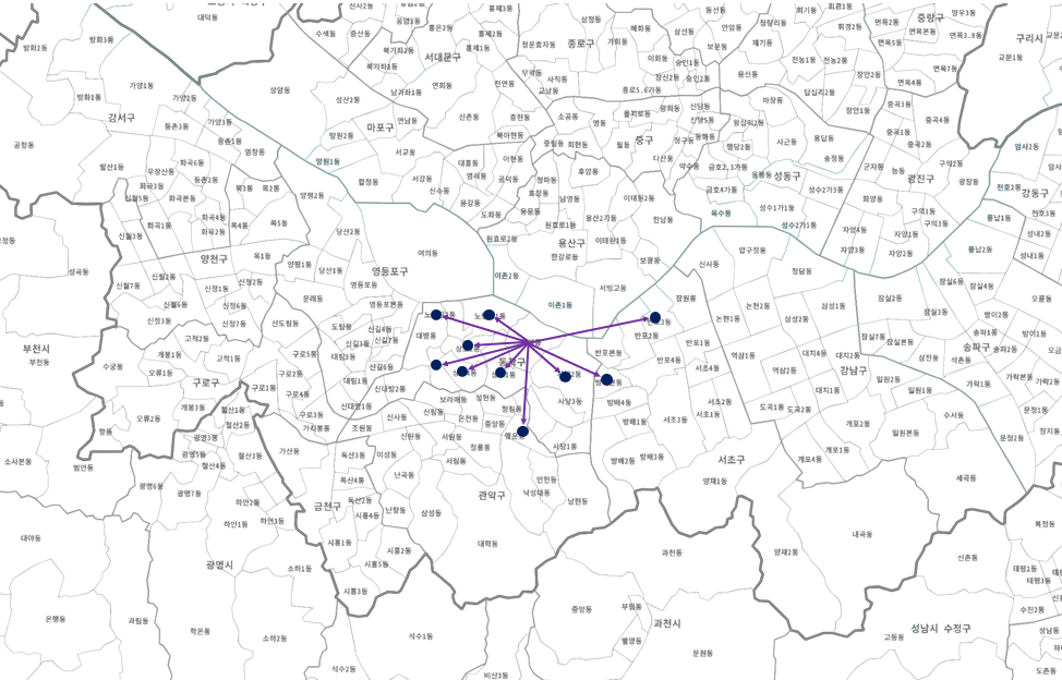 우선 도착지 읍면동 내부에 점을 하나씩 찍고, 출발지인 흑석동에서 실선 화살표로 연결했다.