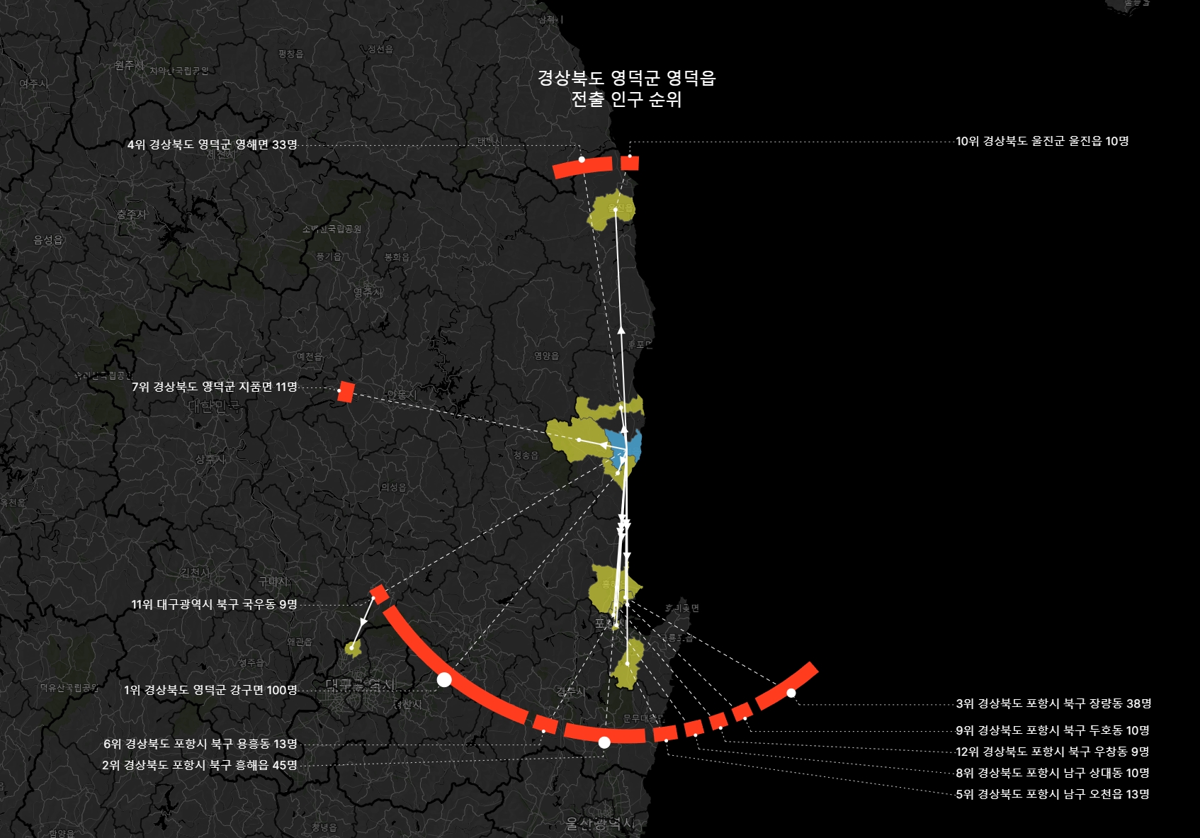 지역만 칠해놓고 보면 어디로 얼마만큼 이동했는지 알기 어렵지만, 환형의 표현을 덧대어보니 남측으로의 이동이 대다수임이 한 눈에 들어온다.