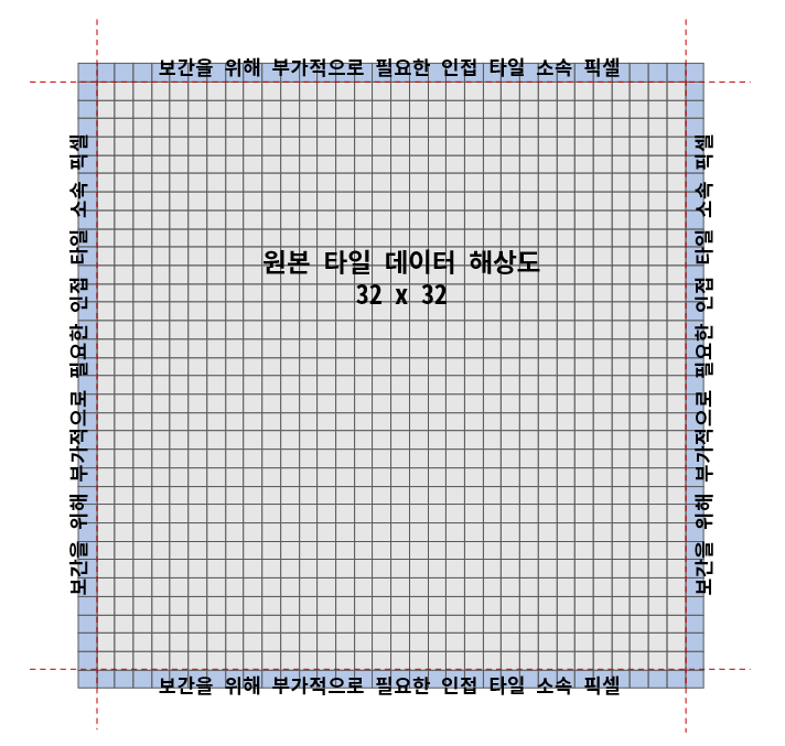 즉, 아래처럼 한 타일을 34x34로 만들어줘야 하고, 가장자리는 34x33 이나 33x34가 될 수 있고, 줌레벨 0인 경우는 32x32가 되어야 한다. 결국 타일이 자연스럽게 그려지도록 하려면 모든 부분들을 커스터마이징해줘야 한다.