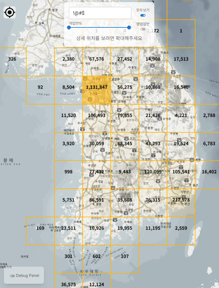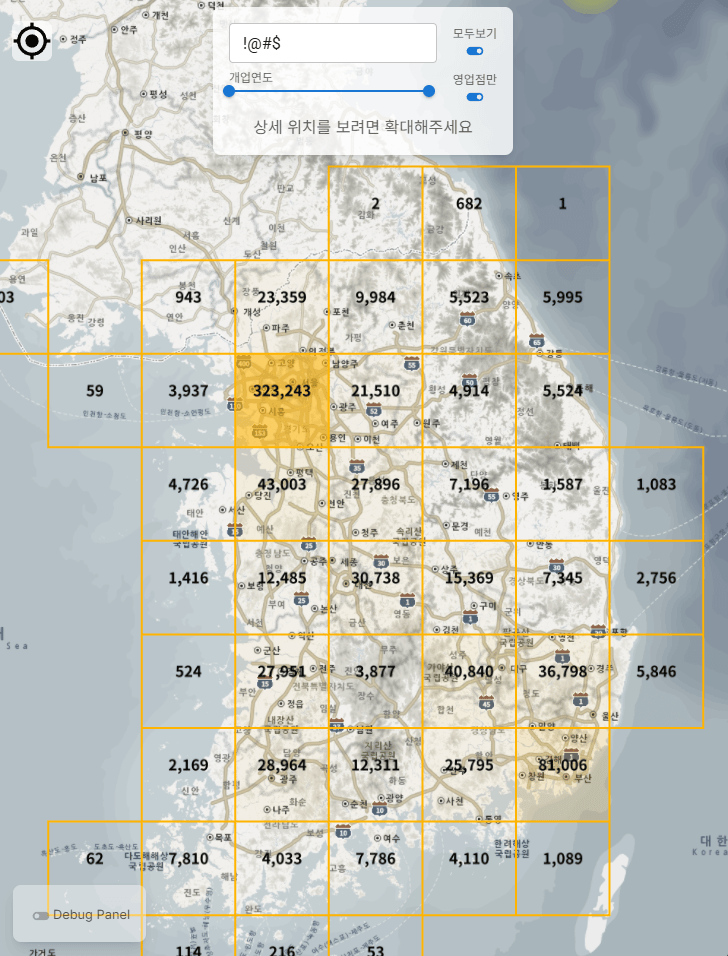 줌 아웃 (격자 표시) — 타일별로 검색 결과 수를 세서 노란색 격자로 표시한다. 투명도가 결과 수에 비례하므로 밀집 지역이 진하게 보인다. '밀면'을 치면 부산 쪽 격자가 가장 진하게 나타난다.