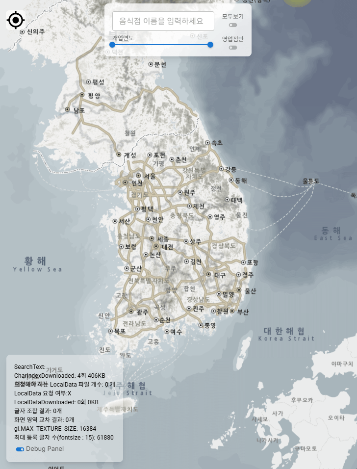 초기 로딩에 필요한 데이터는 quadkey 인덱스(56KB) + 글자 메타데이터(31KB) + 영업 상태 비트맵(38KB) + 연도 인덱스(2.3MB)를 합쳐서 약 2.5MB 정도다. 27MB짜리 글자 인덱스 파일은 통째로 받는 게 아니라 검색할 때 해당 글자의 비트맵만 Range Request로 수~수백KB씩 받고, 한 번 받은 비트맵은 캐싱되므로 검색을 반복할수록 네트워크 요청이 줄어든다. 요즘 LLM 스트리밍 한 번에 수초씩 연결이 열려있고 SNS 피드 스크롤에 수십MB가 오가는 것에 비하면, 이 정도 네트워크 비용은 사용자가 인지하기 어려운 수준이다.