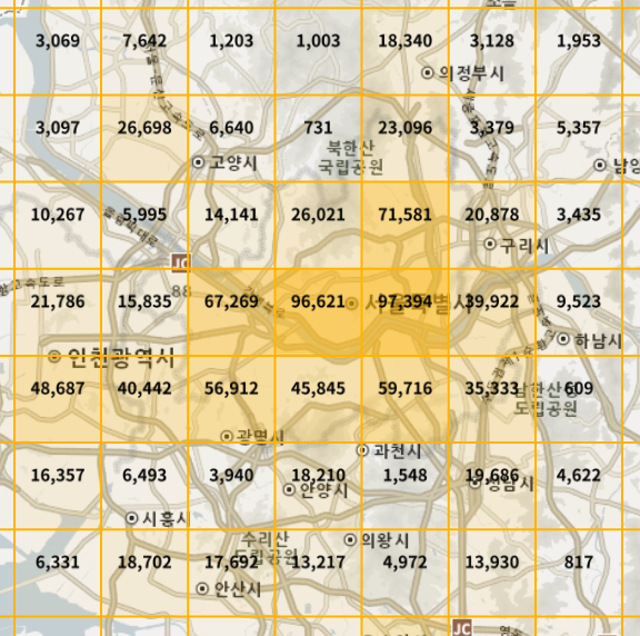 ├── [줌 아웃] 타일별 카운트 → 노란 격자 (QuadkeyLayer)