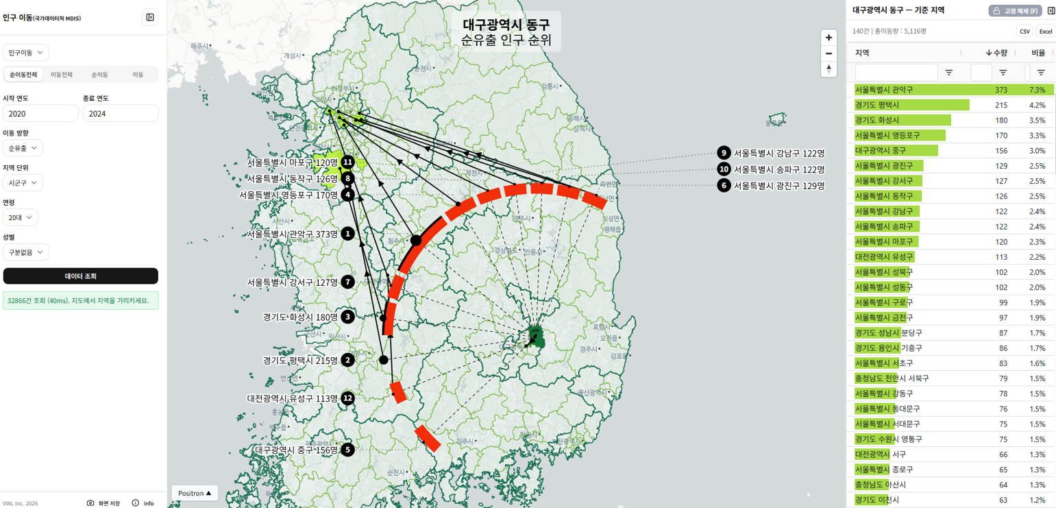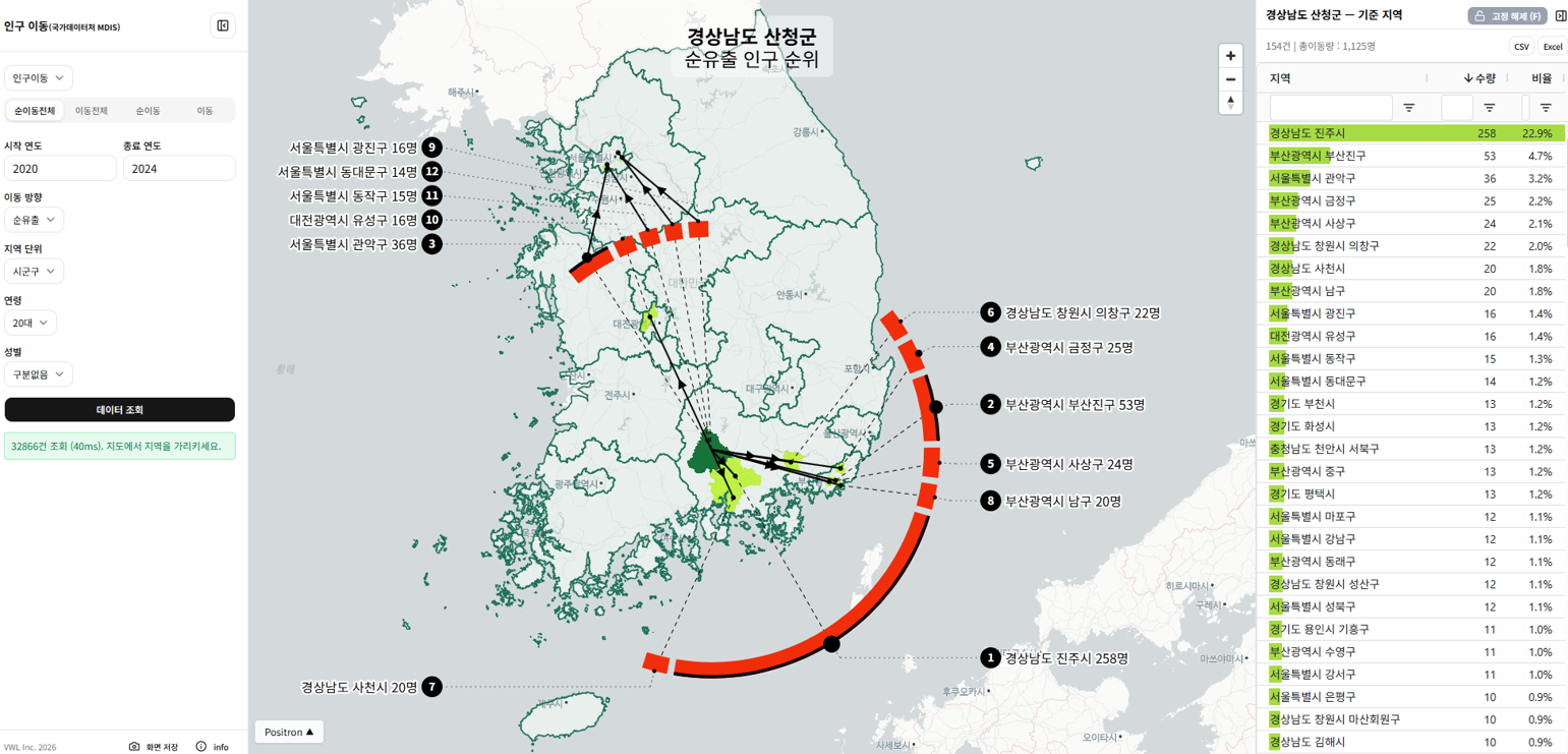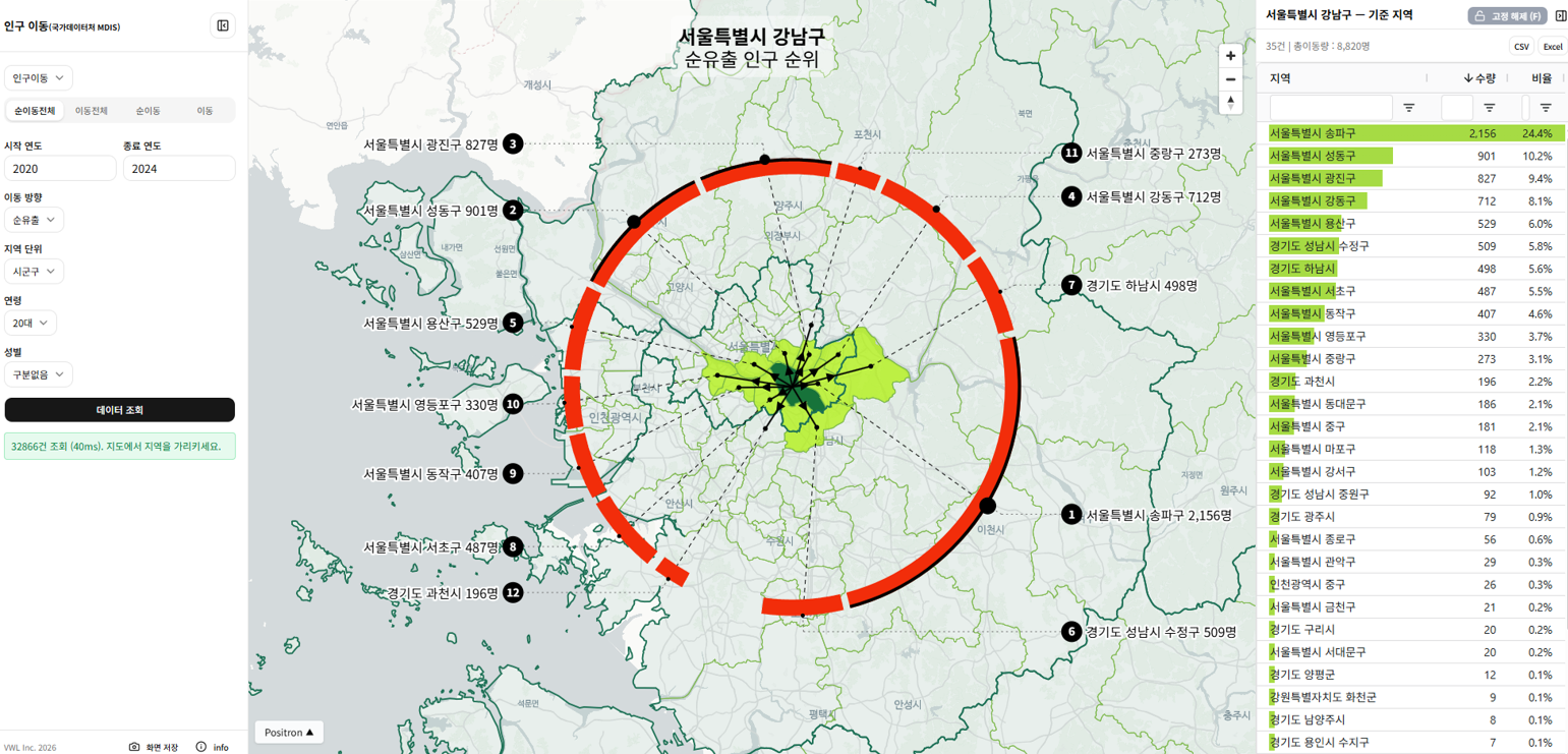 시도/시군구/읍면동 단위의 국내 인구이동을 지도 위에서 탐색합니다.
