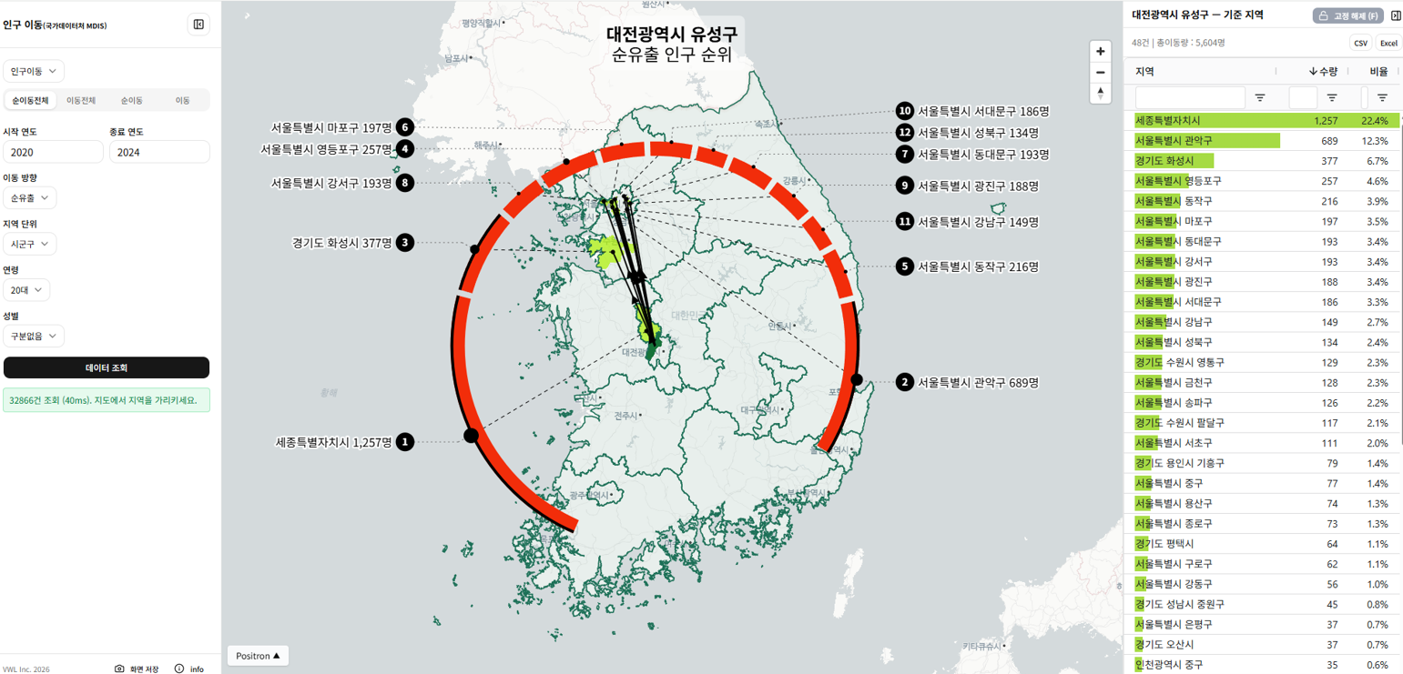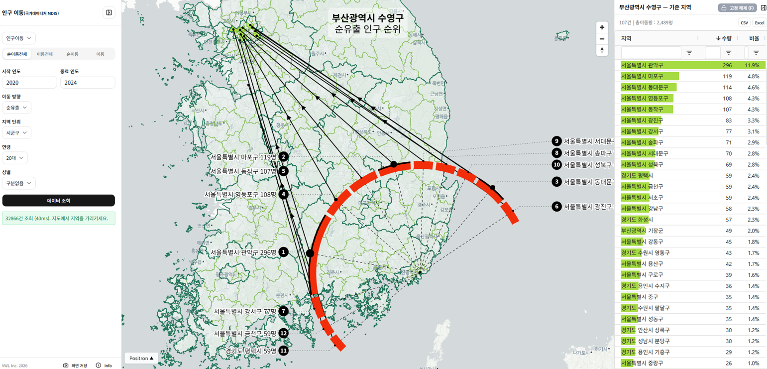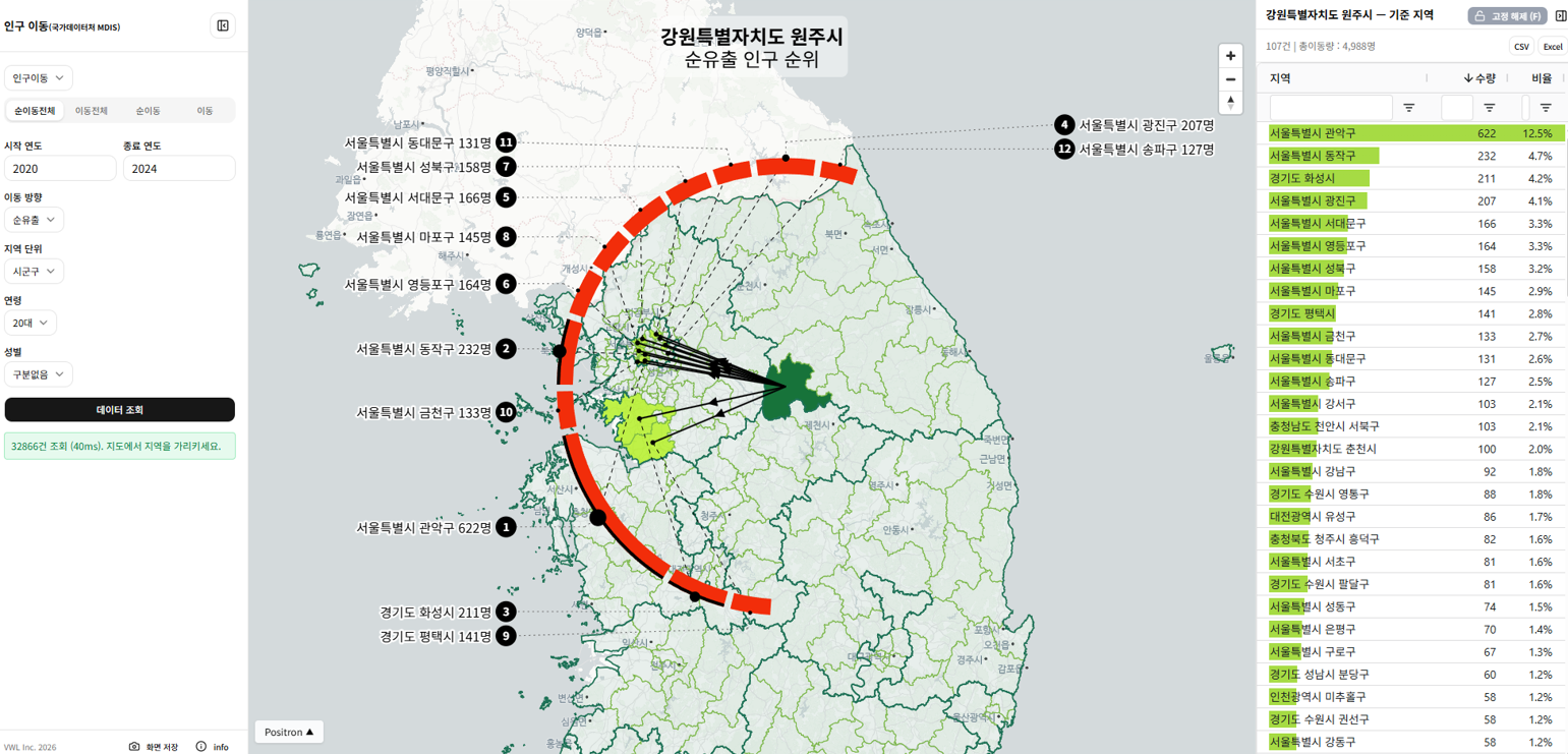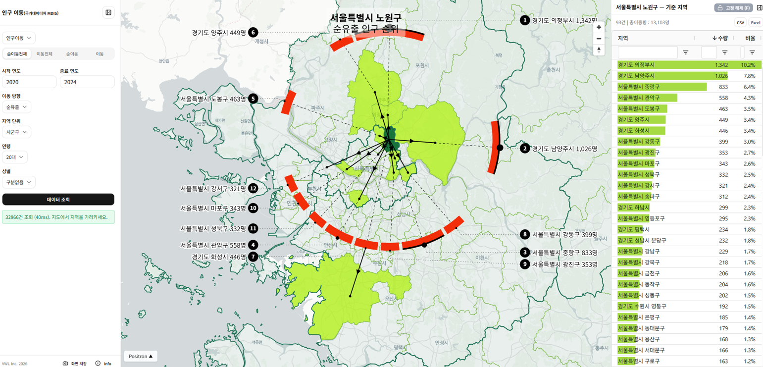 시도/시군구/읍면동 단위의 국내 인구이동을 지도 위에서 탐색합니다.