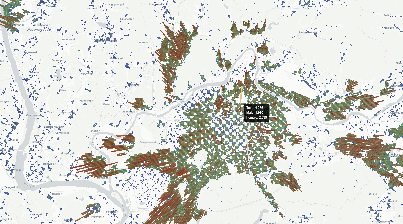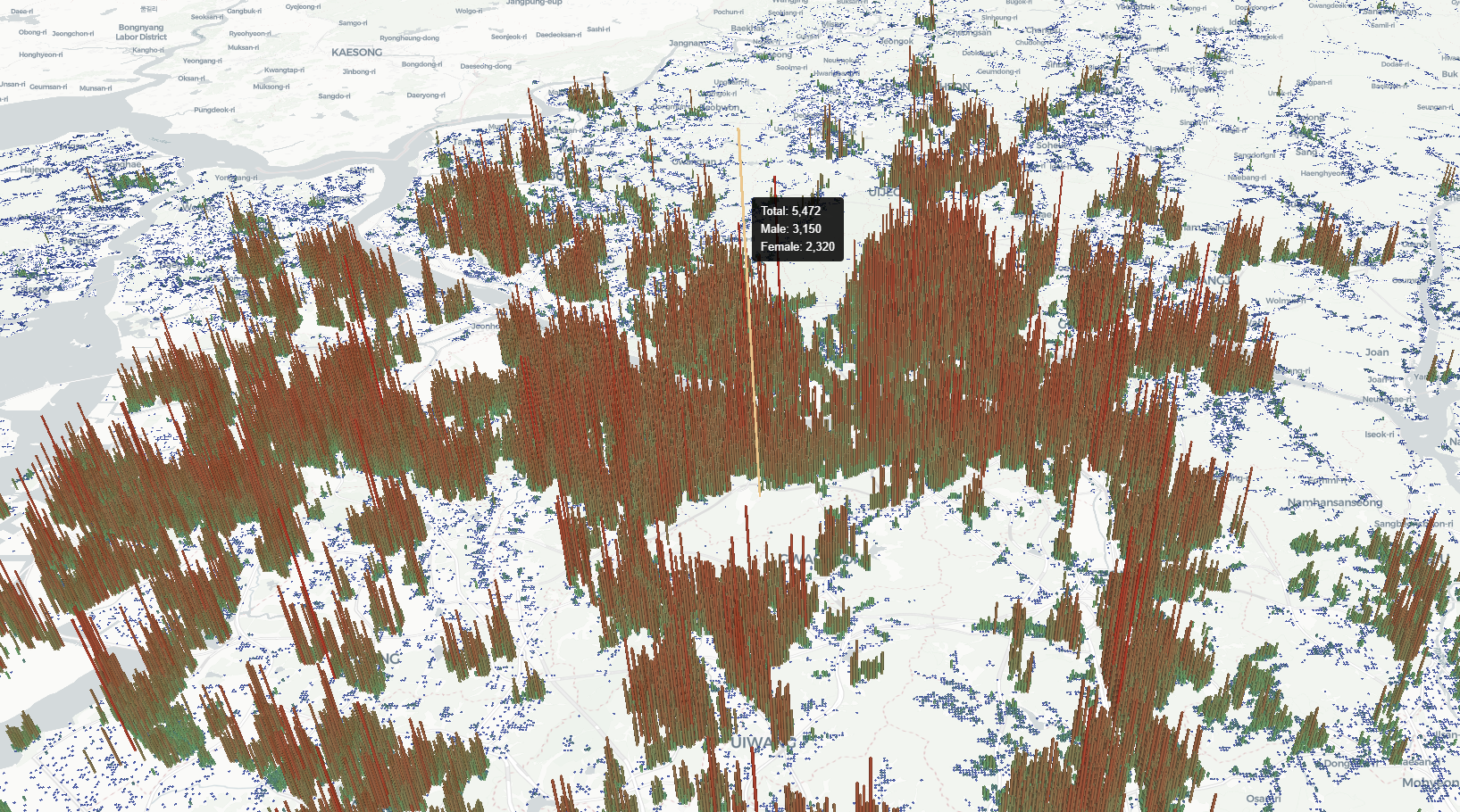 데이터처에서 개방하는 100m 격자 인구도 주소를 기준으로 격자에 할당되기 때문에 아파트나 규모가 큰 집합 건물의 경우 한 좌표에 집중된다는 단점이 있다. 사실 모두 그러한 것 같지는 않은데, 위의 그림에서 대구의 한 지점에 막대가 가장 높게 솟아 있다. 100제곱미터 안에 데이터 상으로 무려 4000명이 거주한다.