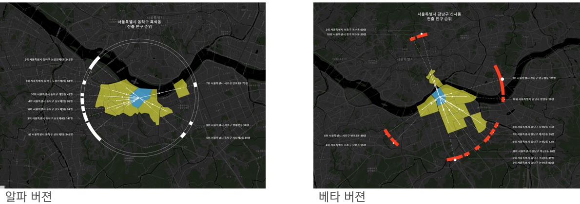 od 데이터의 경우 근거리 이동이 항상 많기 때문에 이동량을 선의 굵기로 표현하면 가까운 곳들은 모두 엉켜서 알아볼 수 없게 되어버린다. 그래서 목적지까지 직선으로 잇고, 인위적으로 그린 바깥의 원에 투영시켜 이동량을 표현하였다.